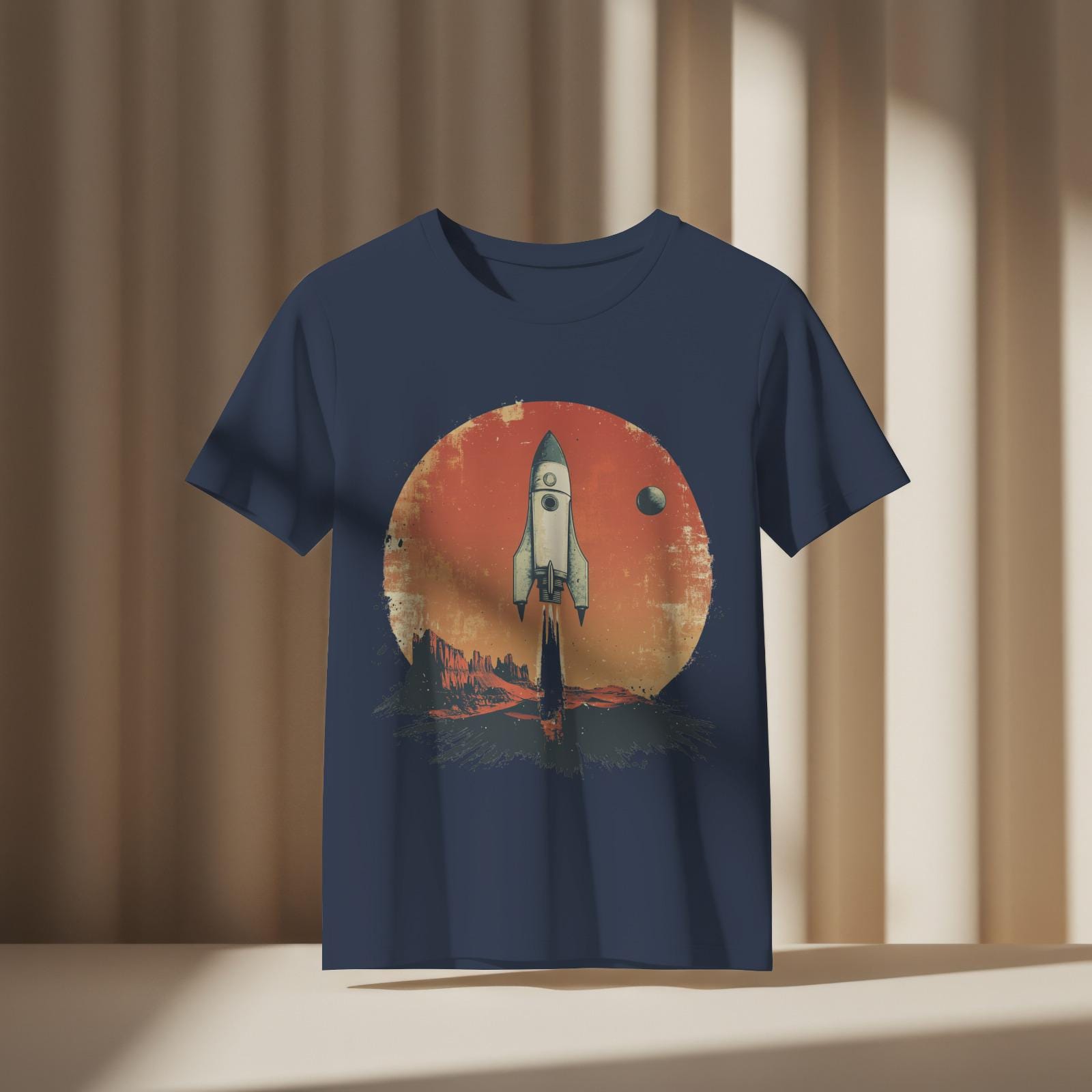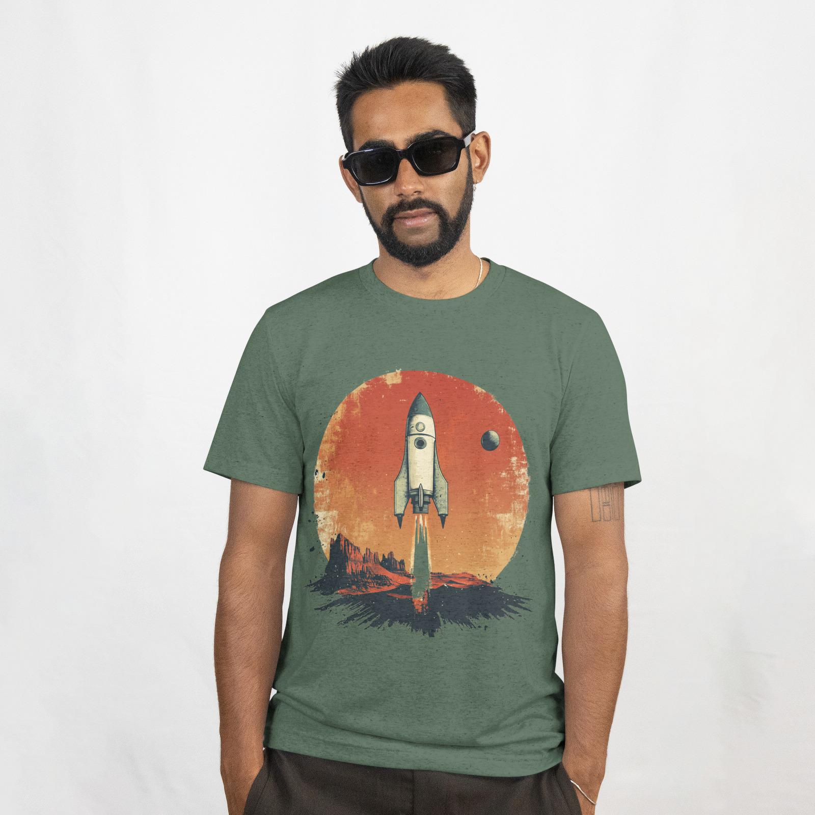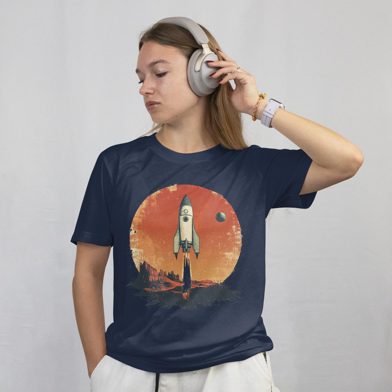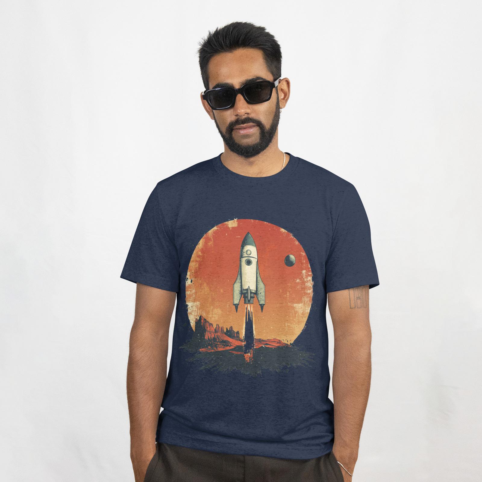 This T-Shirt features retro sci-fi movie poster elements, showcasing a stylized rocket ship and a distant planet, combined with a faded photograph of a desert landscape and a handwritten quote about exploration. It exudes an adventurous and nostalgic vibe, perfect for those who love drama and backlighting. Ideal for sci-fi enthusiasts, adventurers, and retro design lovers. Perfect for gifting on birthdays, holidays, and special occasions.