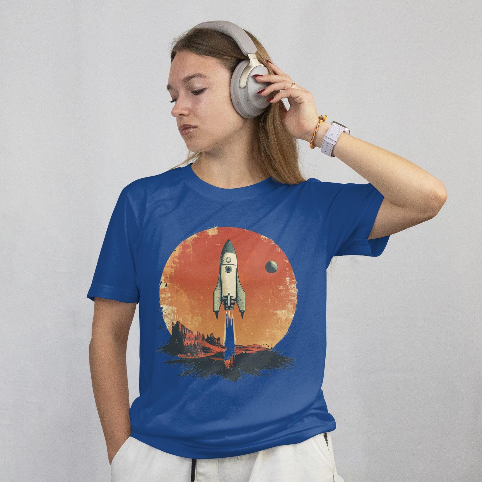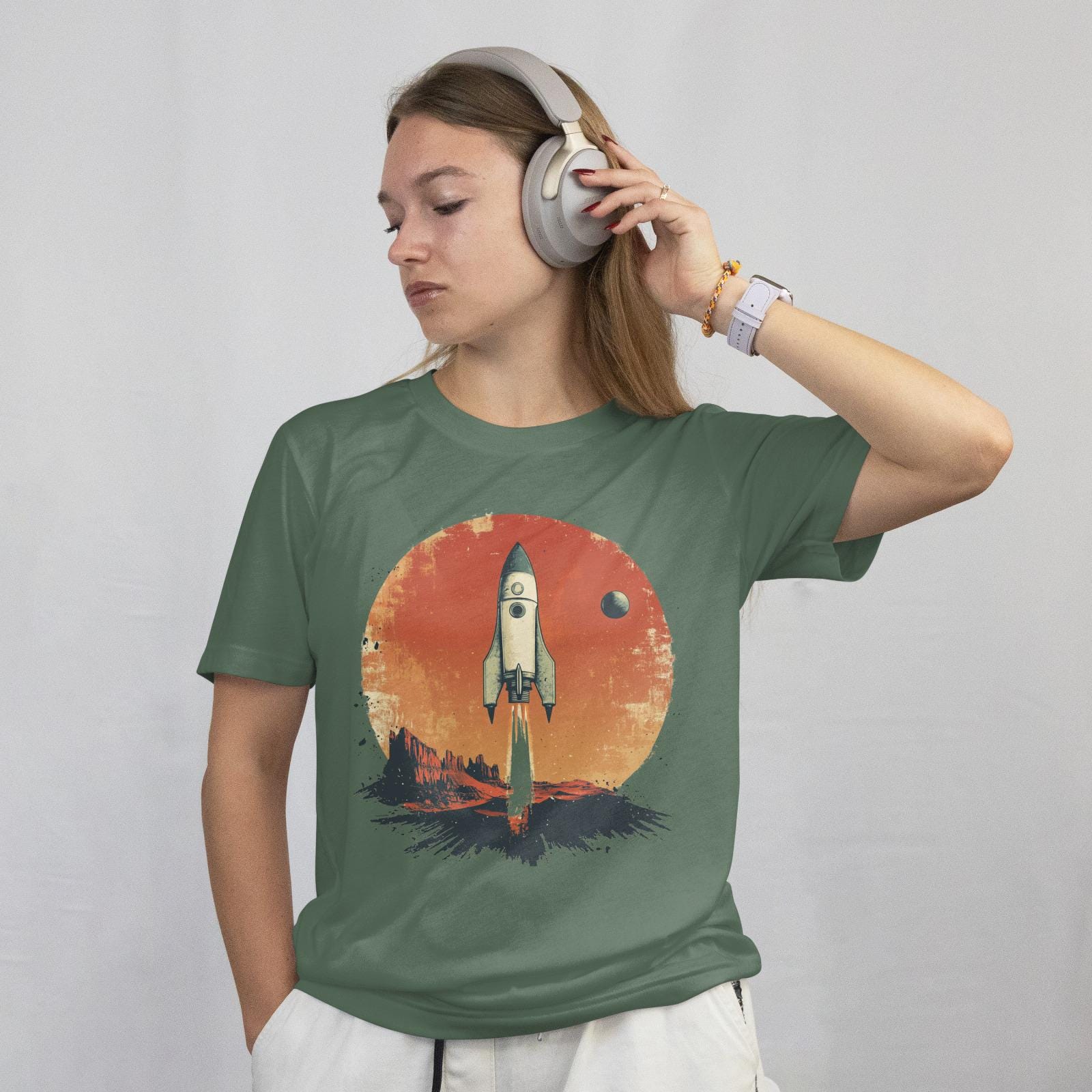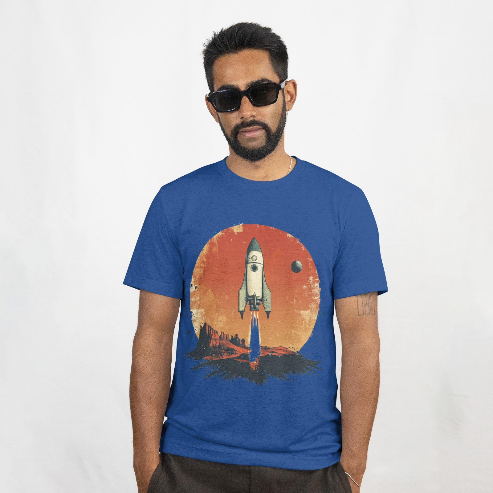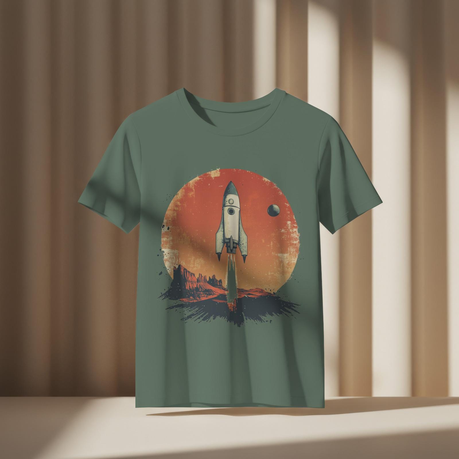 This T-Shirt features retro sci-fi movie poster elements, showcasing a stylized rocket ship and a distant planet, combined with a faded photograph of a desert landscape and a handwritten quote about exploration. It exudes an adventurous and nostalgic vibe, perfect for those who love drama and backlighting. Ideal for sci-fi enthusiasts, adventurers, and retro design lovers. Perfect for gifting on birthdays, holidays, and special occasions.