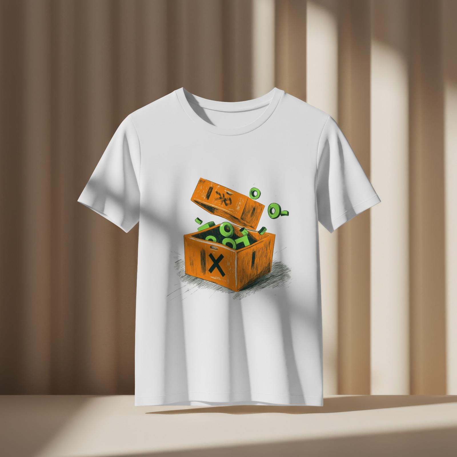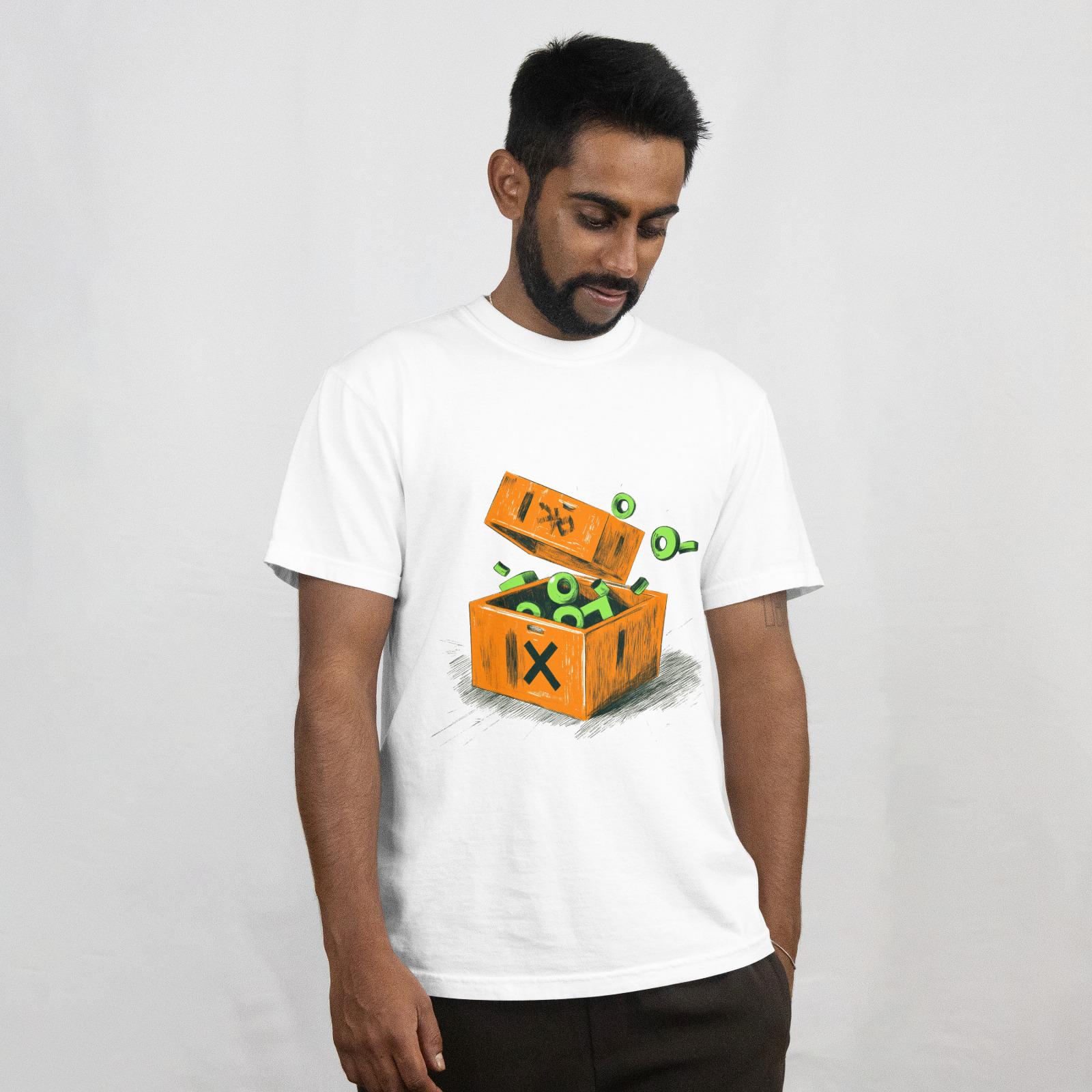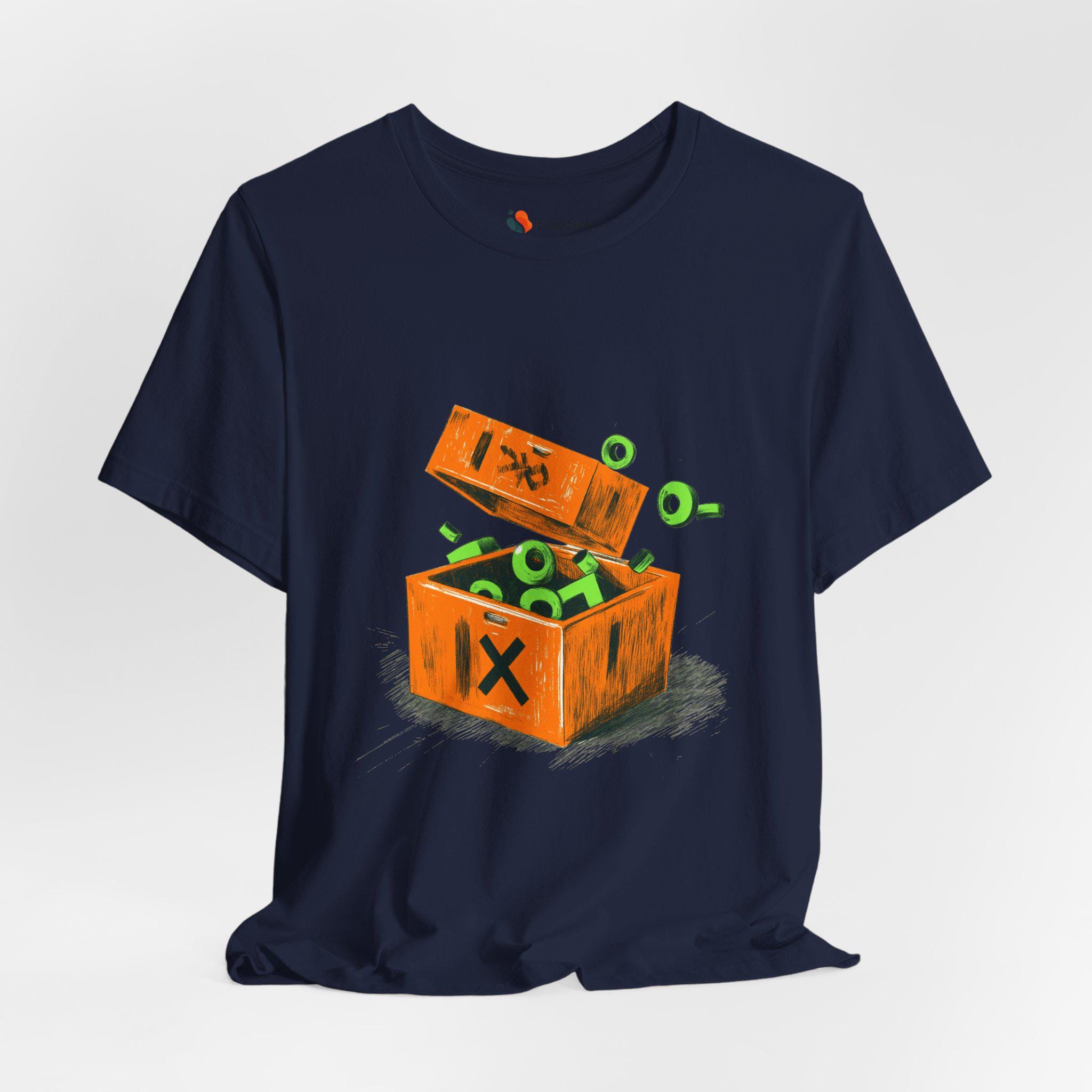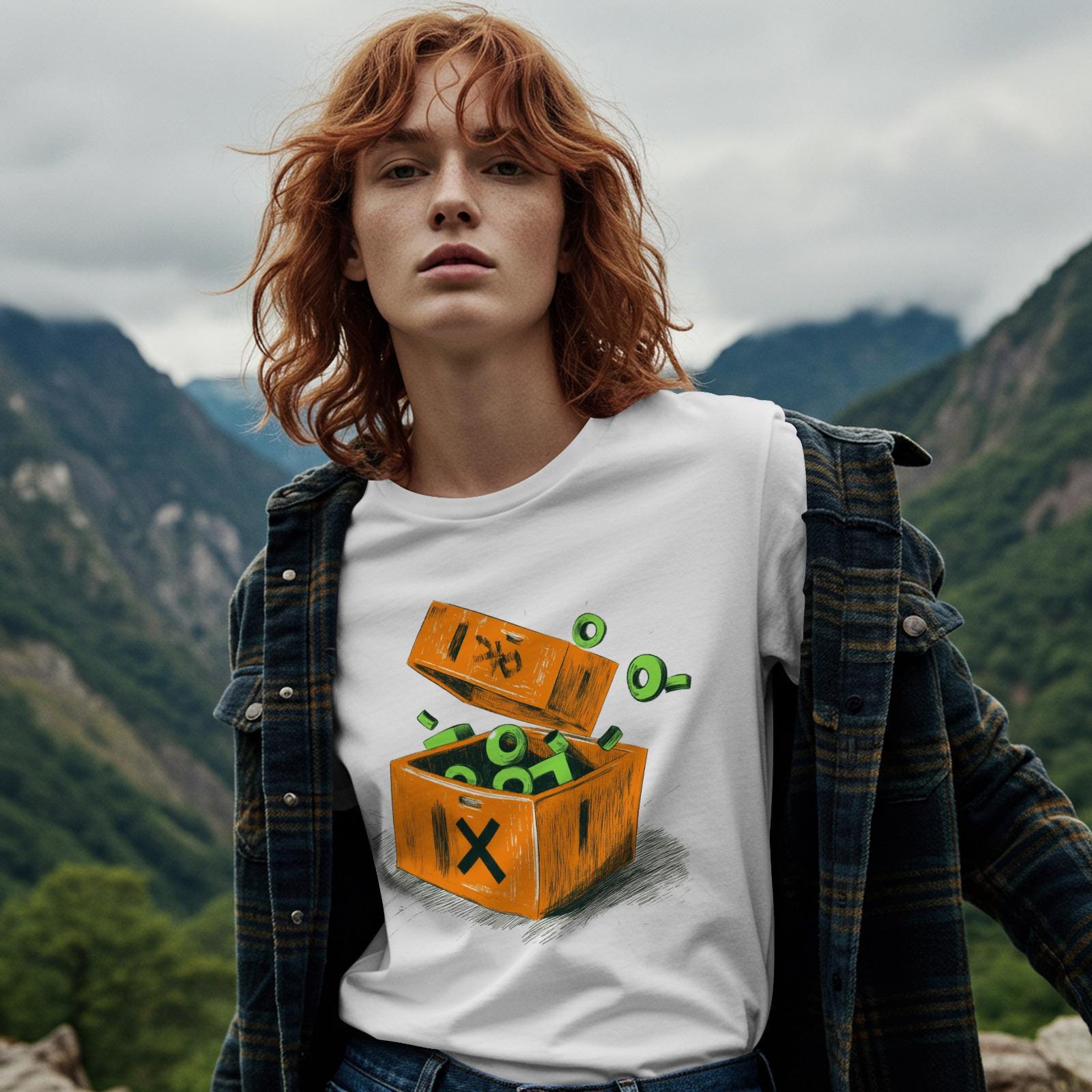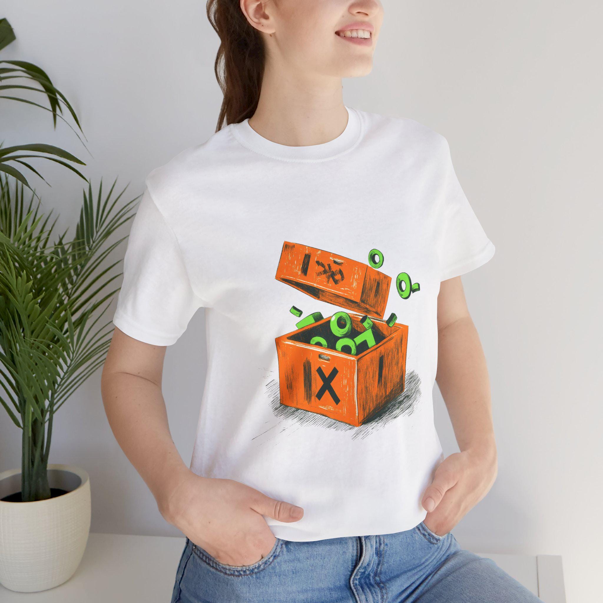 A whimsical and lighthearted Tee featuring a playful arrangement of stylized orange crates with vibrant green "X" and "O" shapes scattered playfully. The bold graphic style and vintage color evoke a fun and playful atmosphere, perfect for casual and leisure wear. Ideal for adults looking to add a touch of creativity to their everyday outfits. Relevant for holidays like Halloween, casual gatherings, and relaxed occasions.