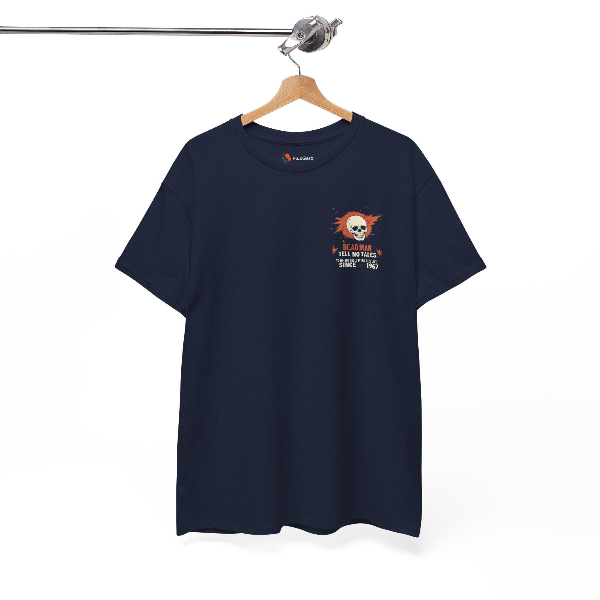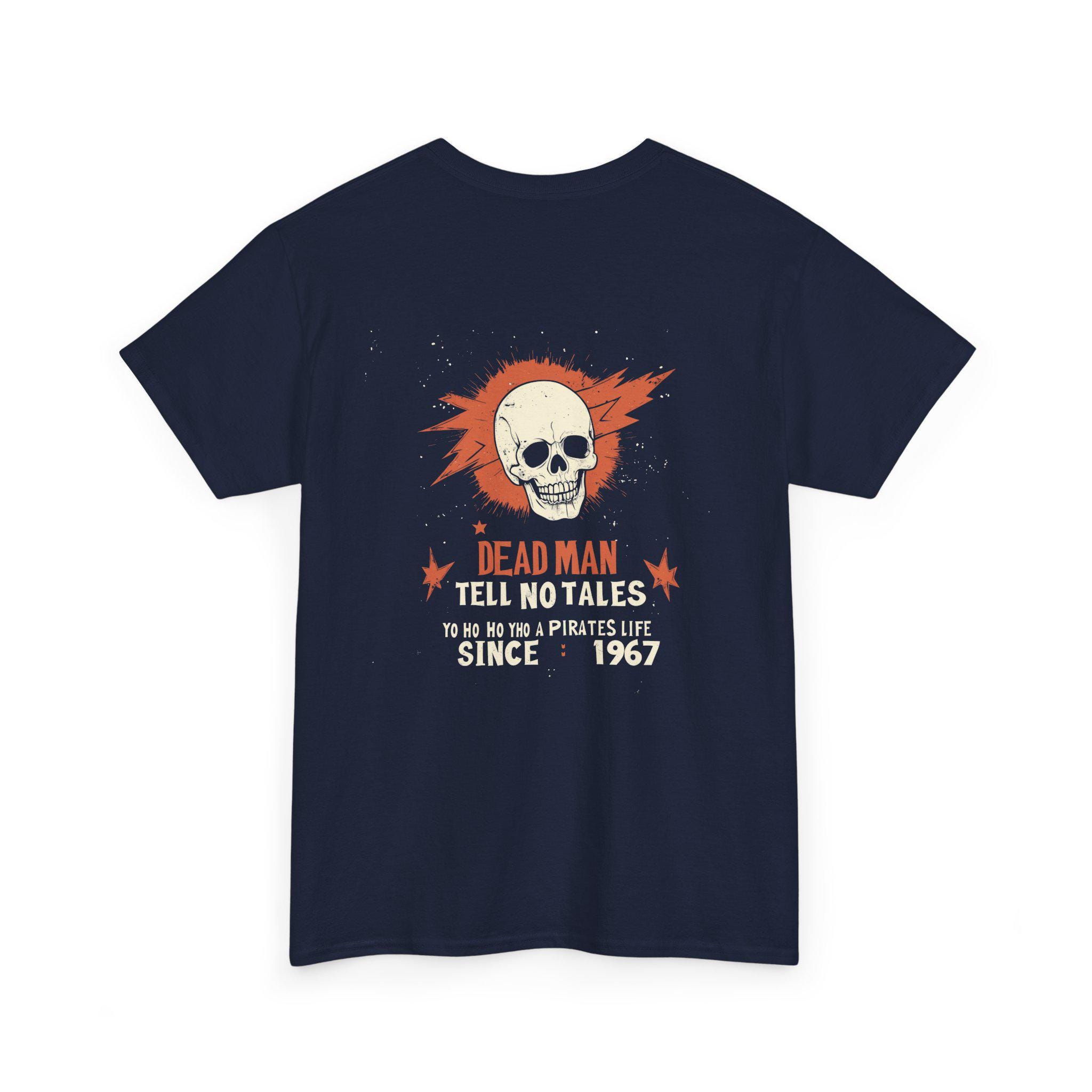 A versatile and classic t-shirt featuring the quote 'Dead men tell no tales'. Perfect for those who appreciate timeless and statement pieces in their wardrobe. Ideal for casual wear and can be styled for various occasions, making it a great addition to any closet. Relevant for fans of pirate culture and those who enjoy unique quotes on their clothing. Suitable for Halloween, Pirate Day, or any occasion where a touch of mystery is desired.