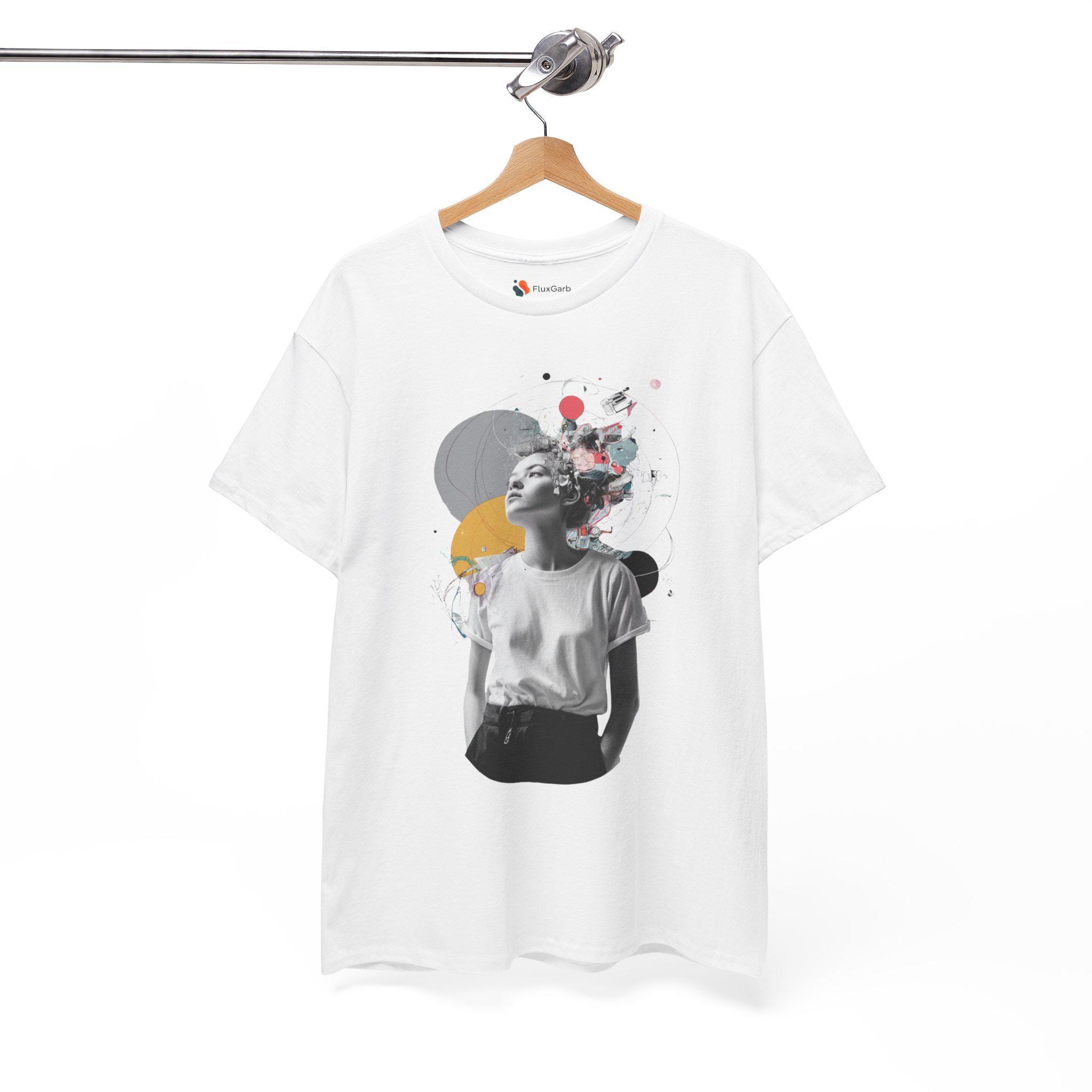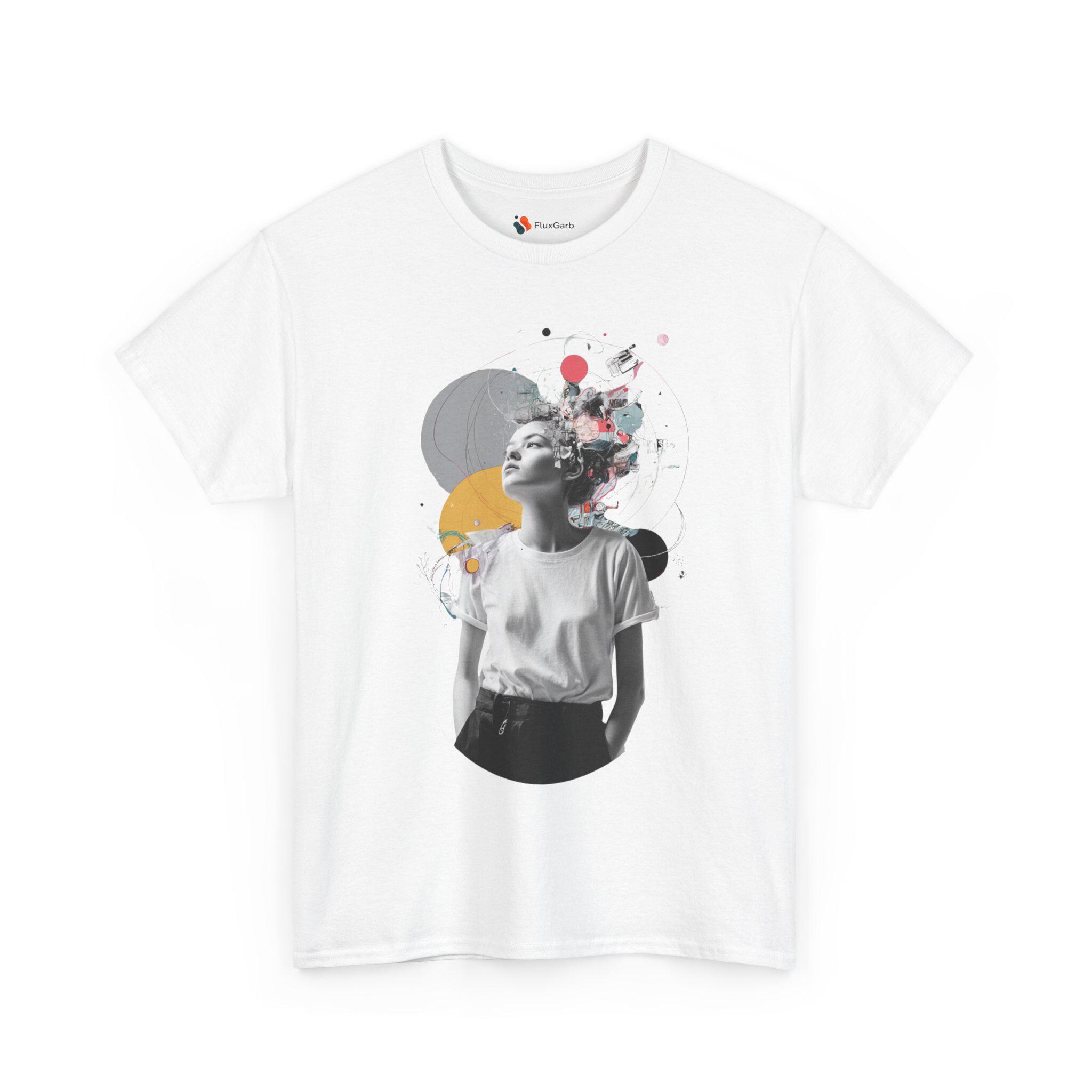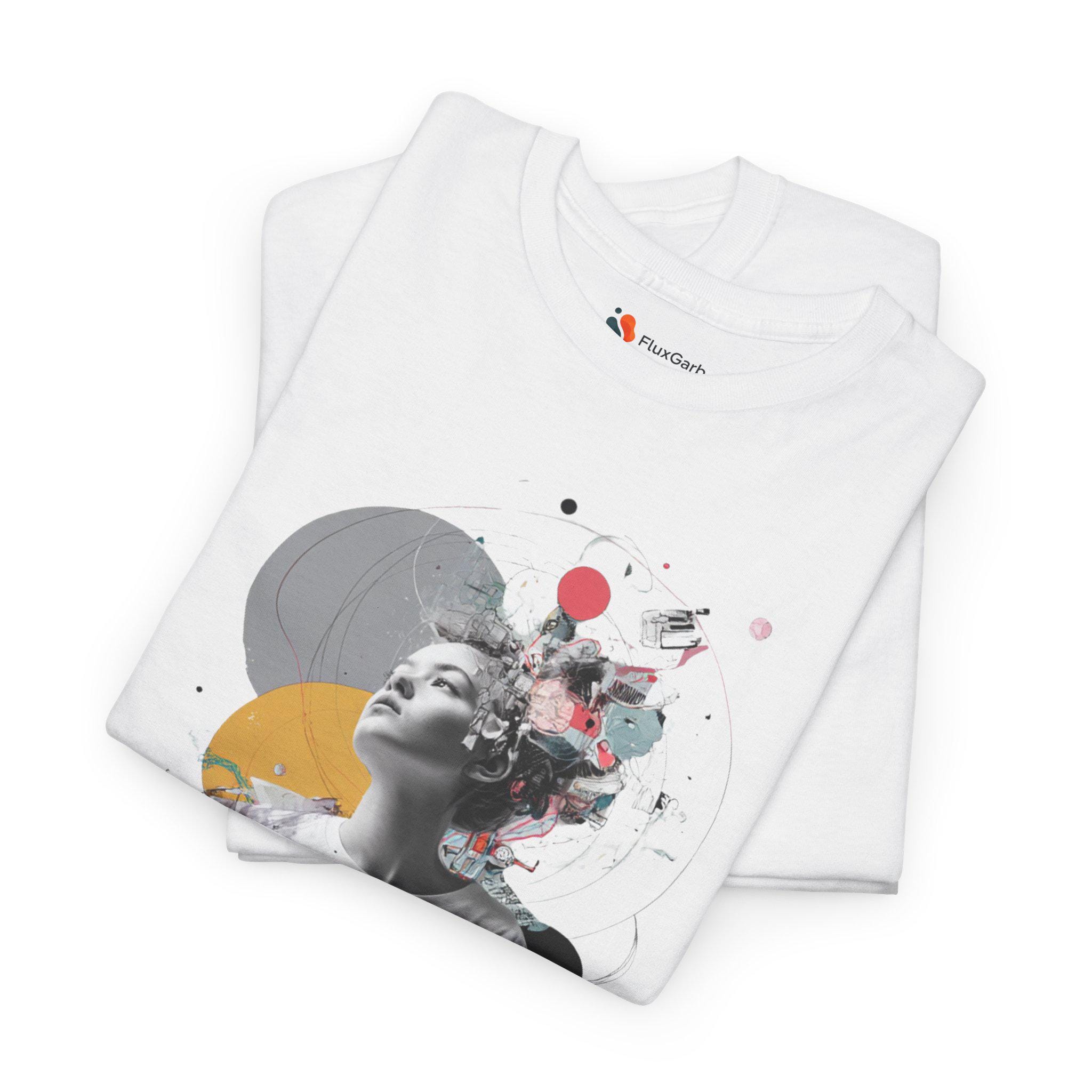 A black and white portrait T-Shirt featuring a young woman with a vibrant, abstract explosion of colors, creating a sense of dynamic thought and imagination. This T-Shirt is perfect for those who appreciate unique and creative designs, adding a touch of artistry to their wardrobe. Ideal for art enthusiasts and individuals who enjoy expressive fashion. Suitable for casual wear, art events, creative gatherings, and as a statement piece during art-themed occasions.
