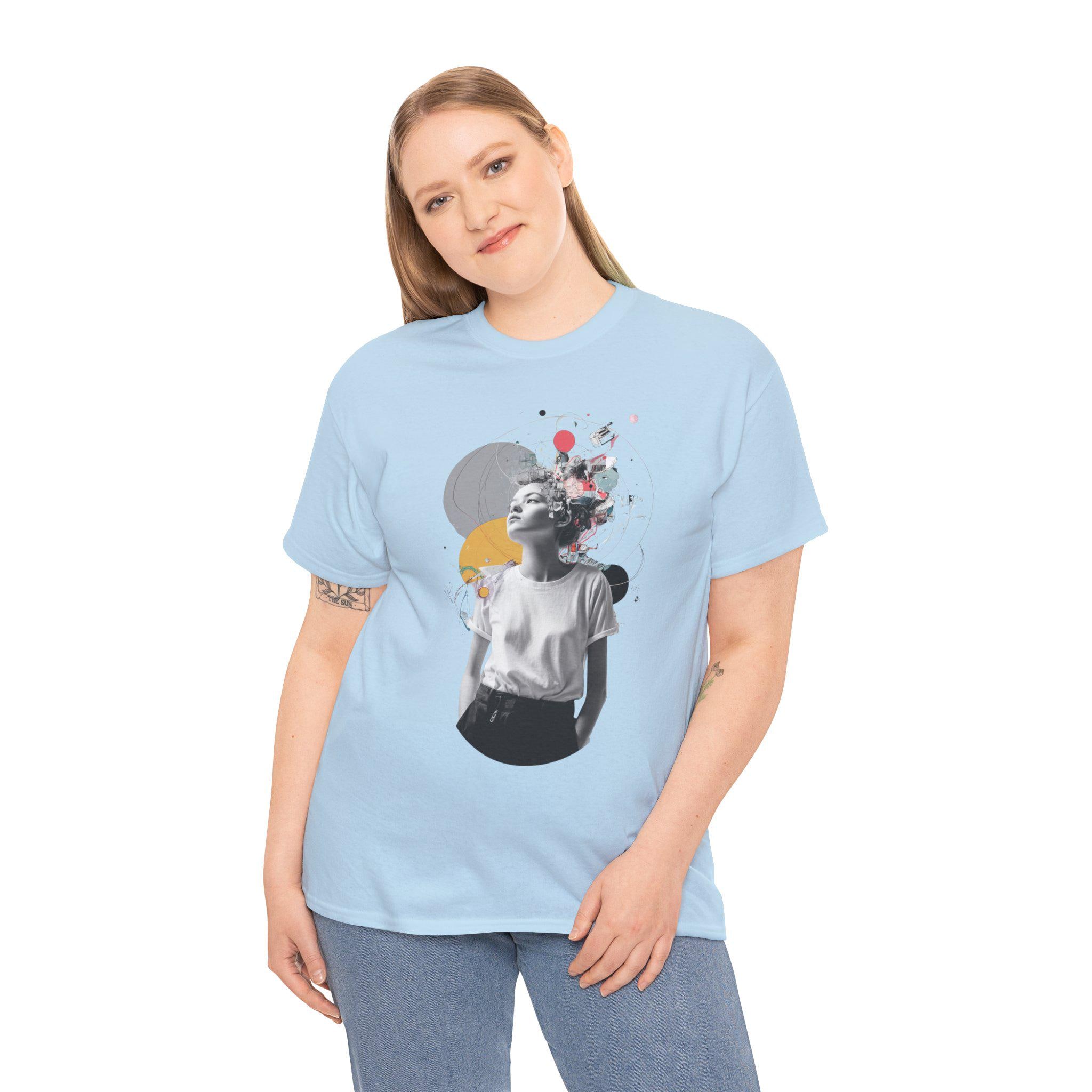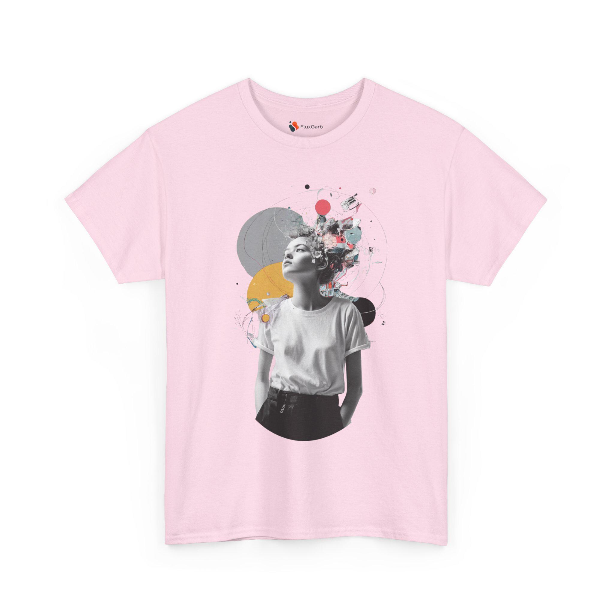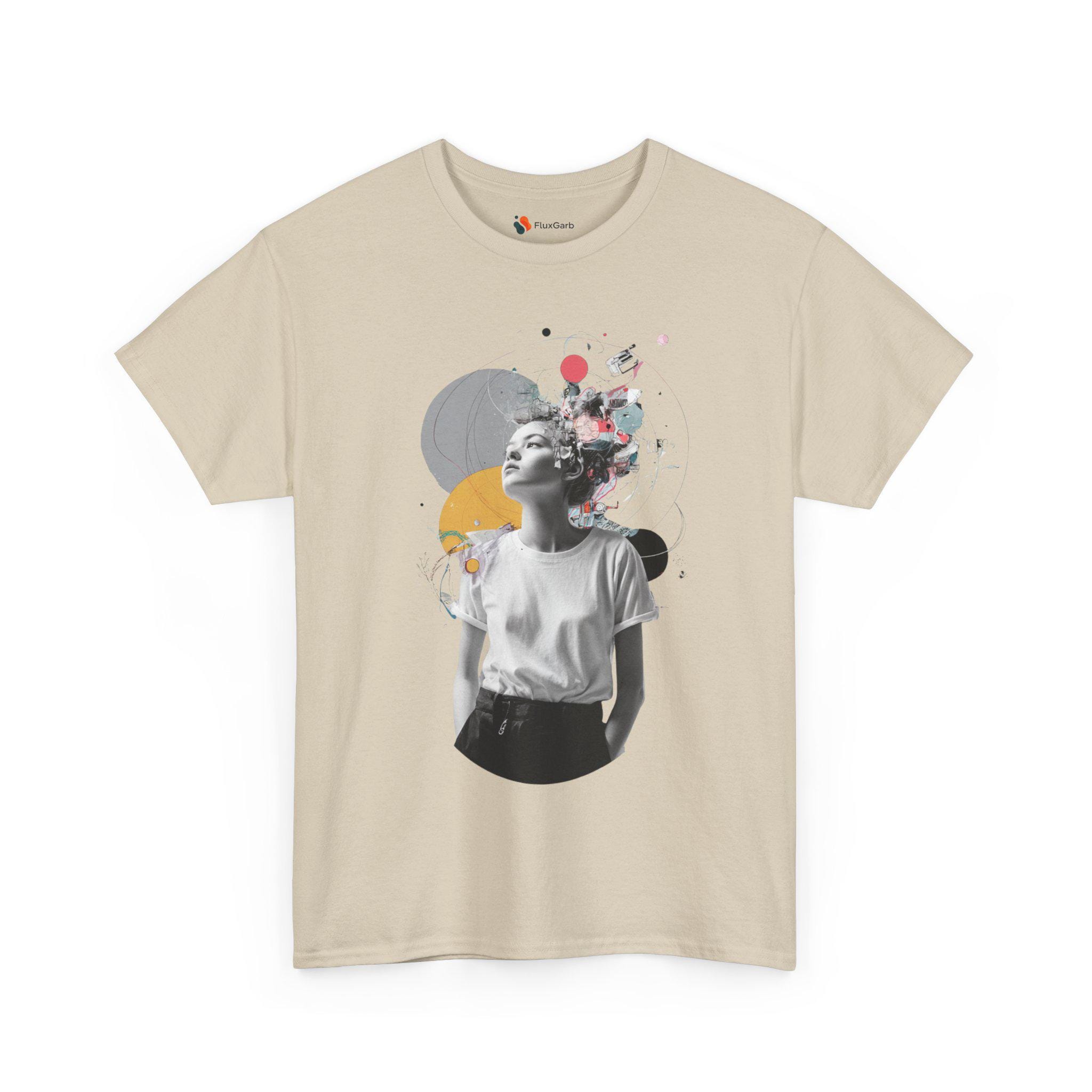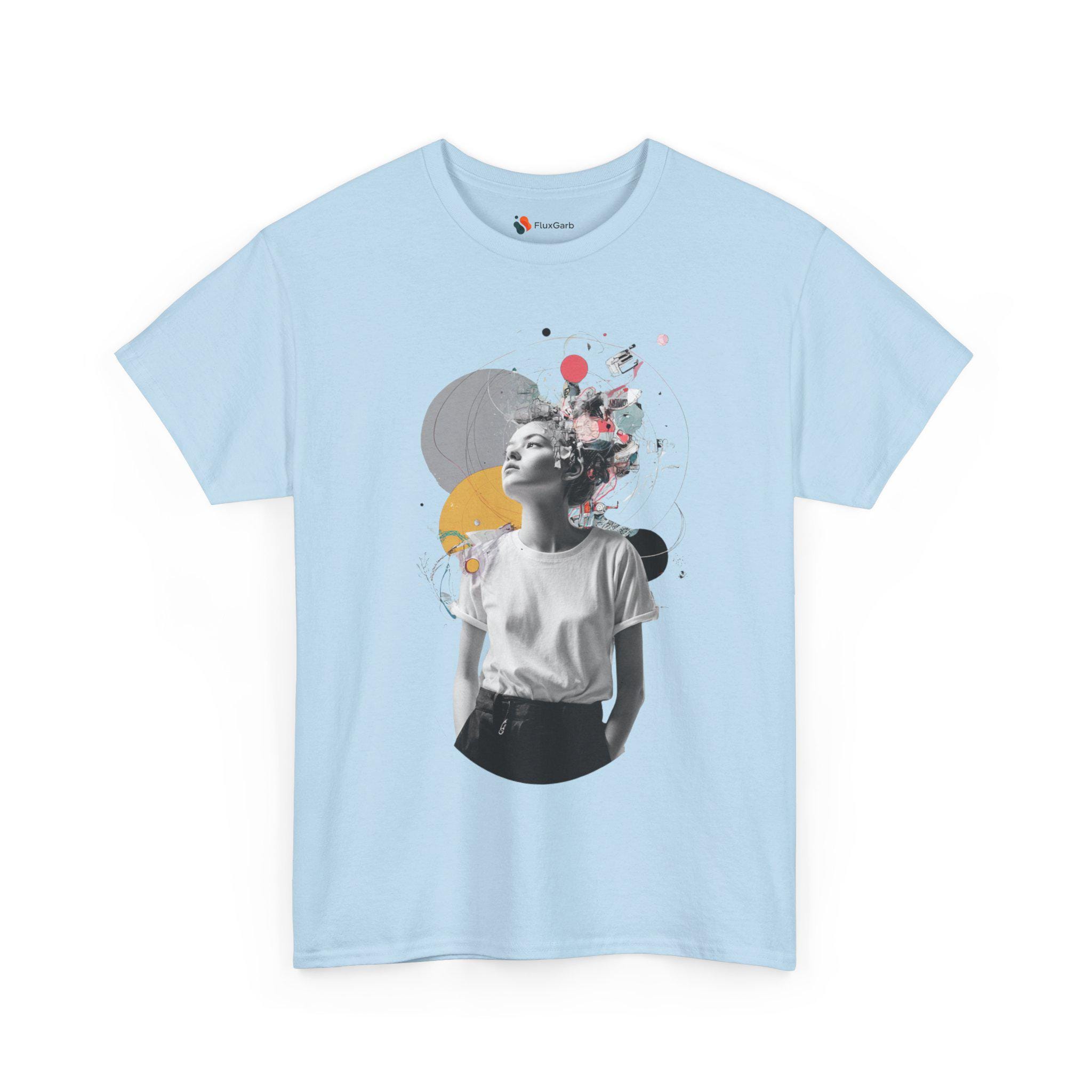 A black and white portrait T-Shirt featuring a young woman with a vibrant, abstract explosion of colors, creating a sense of dynamic thought and imagination. This T-Shirt is perfect for those who appreciate unique and creative designs, adding a touch of artistry to their wardrobe. Ideal for art enthusiasts and individuals who enjoy expressive fashion. Suitable for casual wear, art events, creative gatherings, and as a statement piece during art-themed occasions.