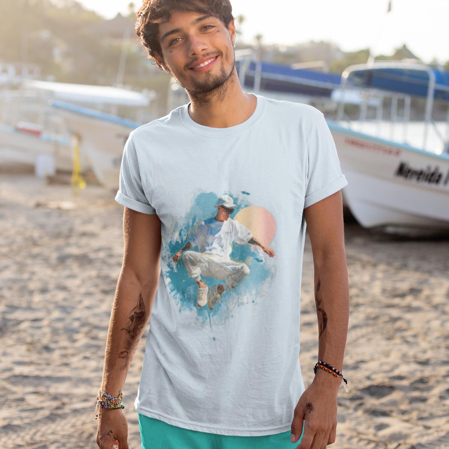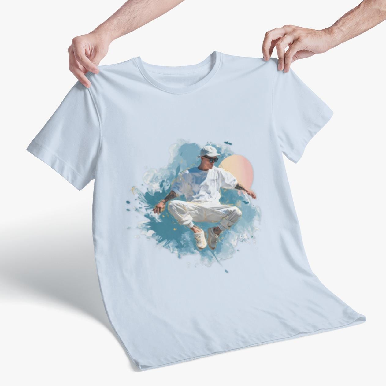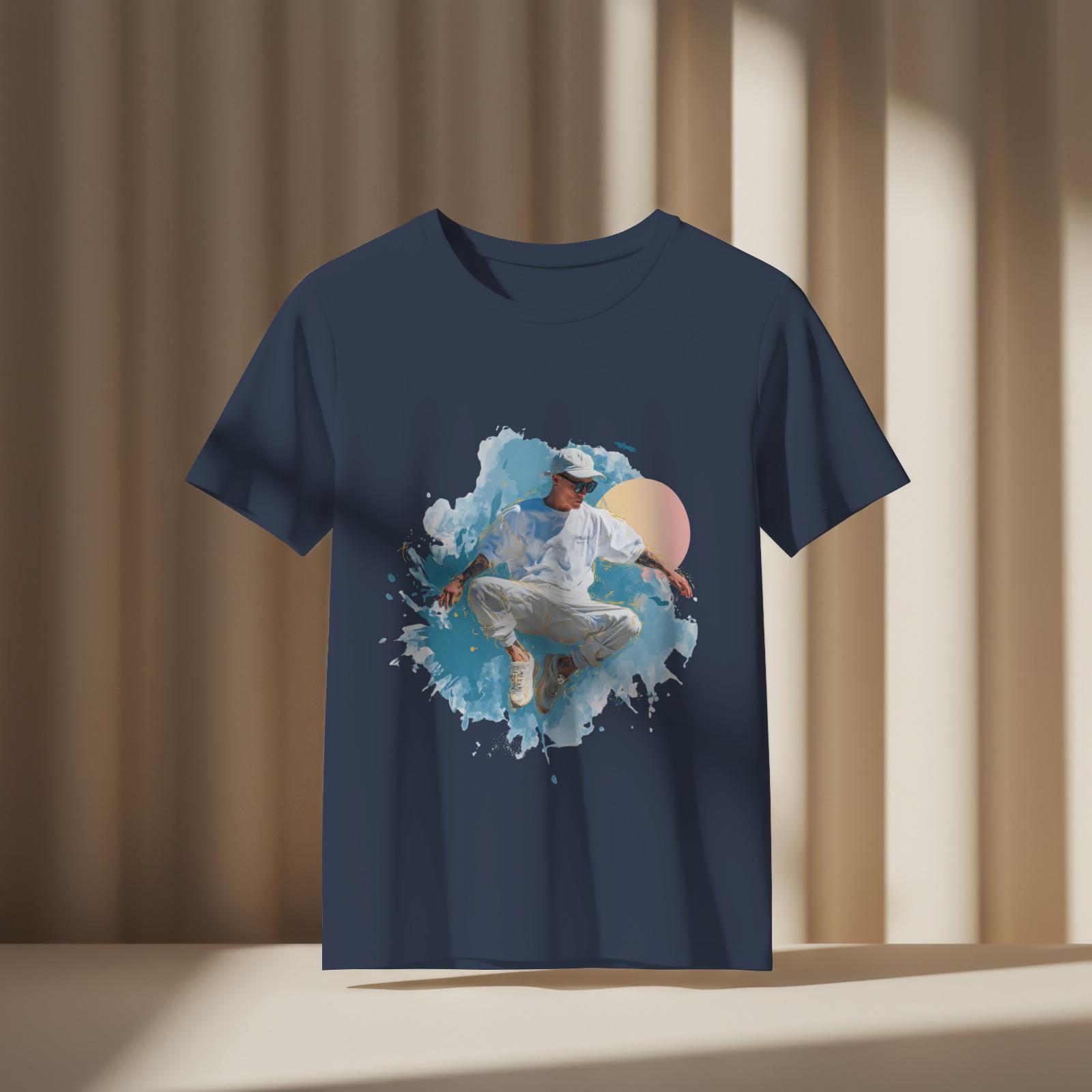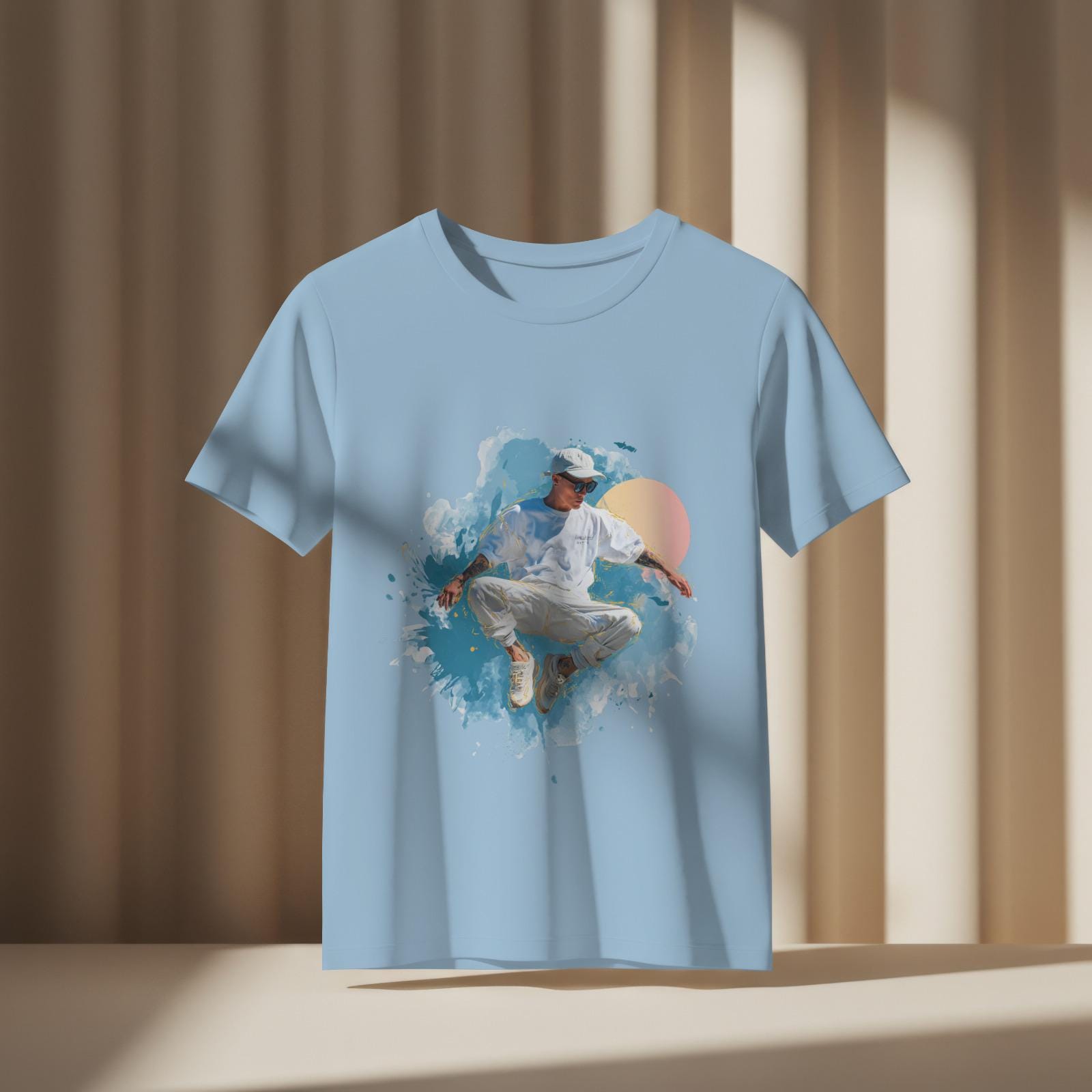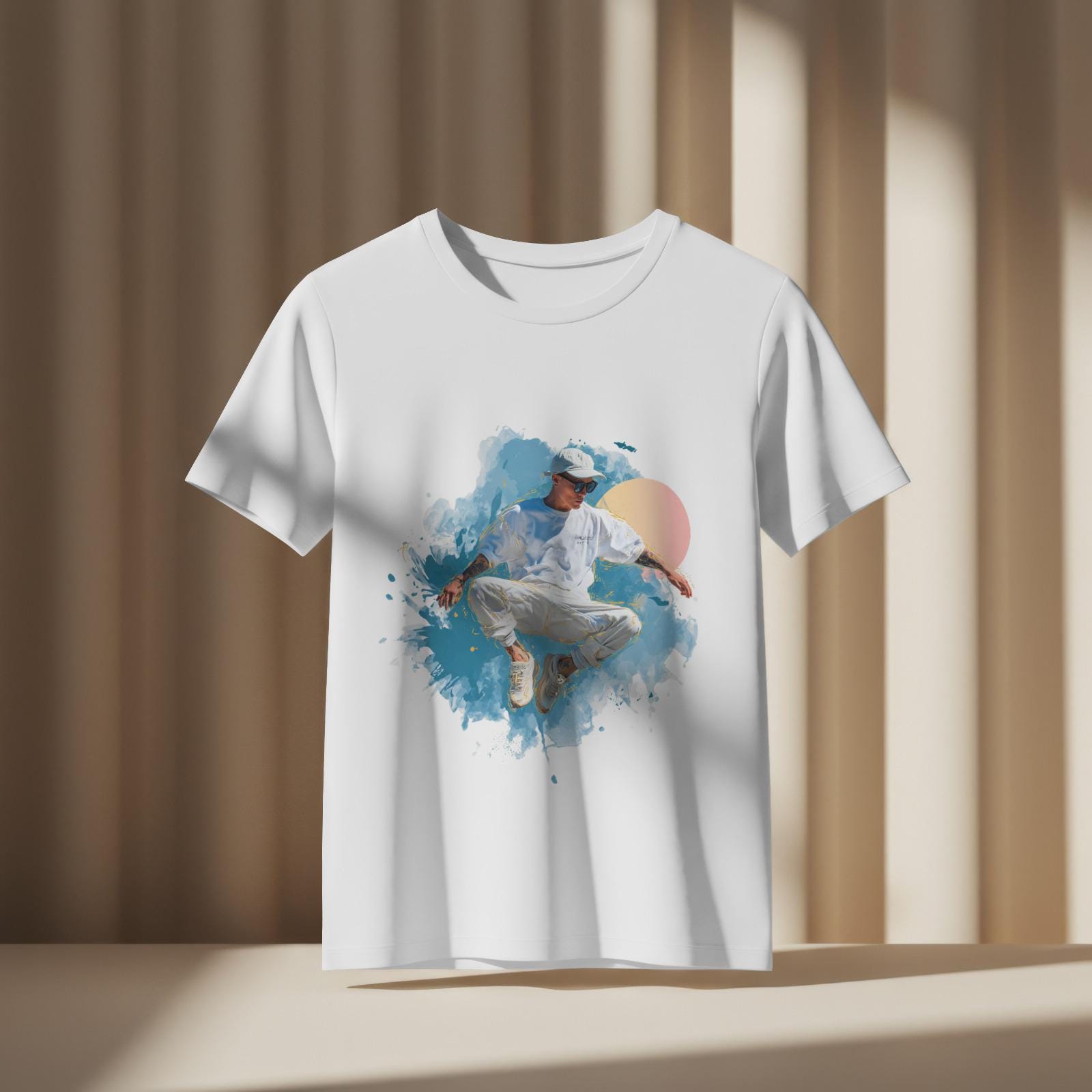 A dynamic and modern unisex T-shirt featuring a male figure in a jumping pose, set against a vibrant watercolor-like background. This shirt exudes energy and style, perfect for those who enjoy unique, artistic designs. Ideal for casual wear or standing out at social events and gatherings. Relevant for birthdays, concerts, art events, and casual outings.