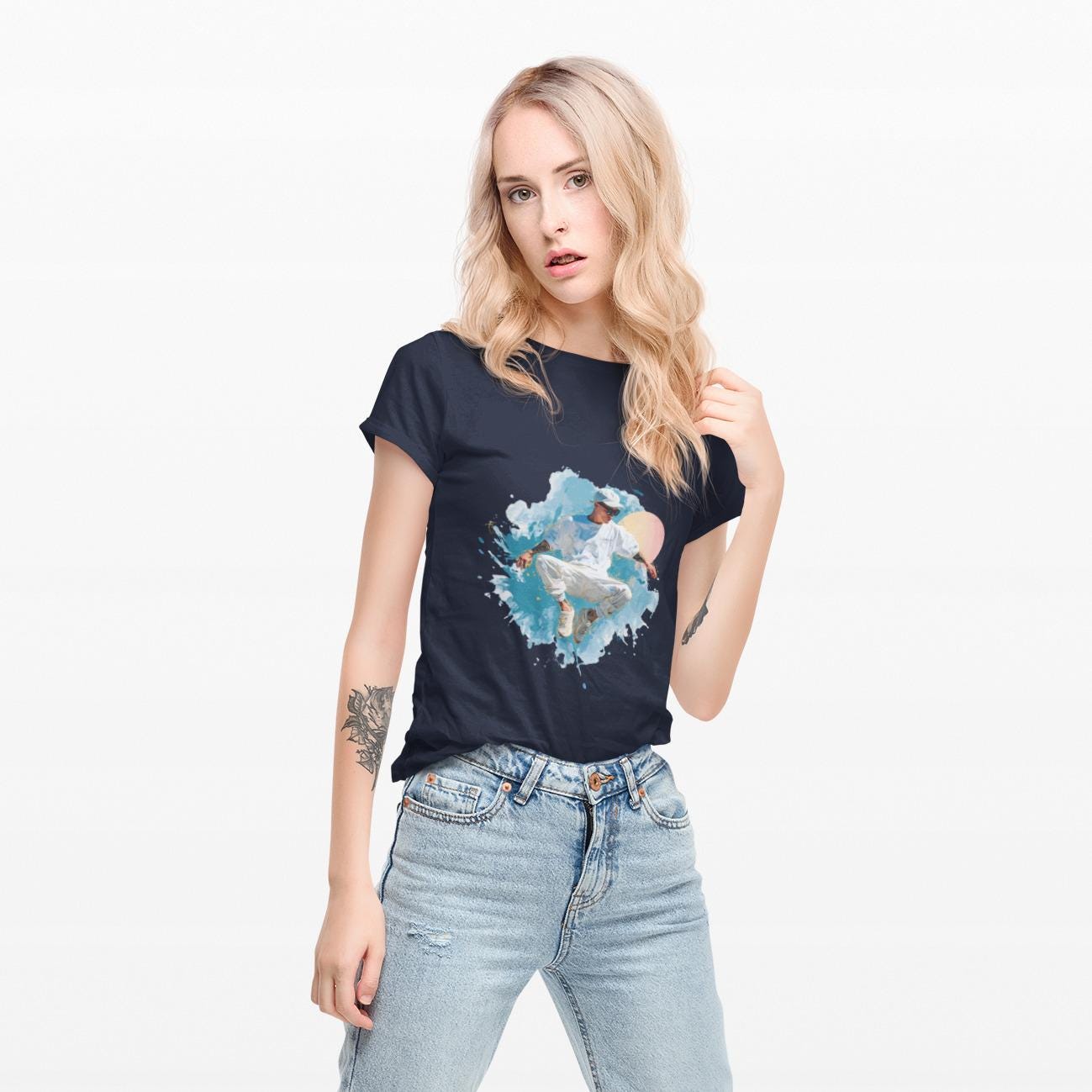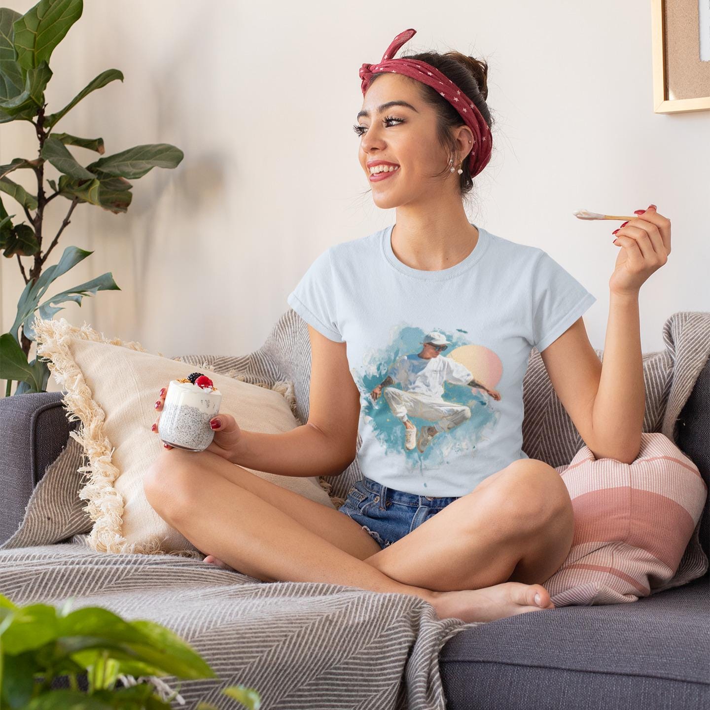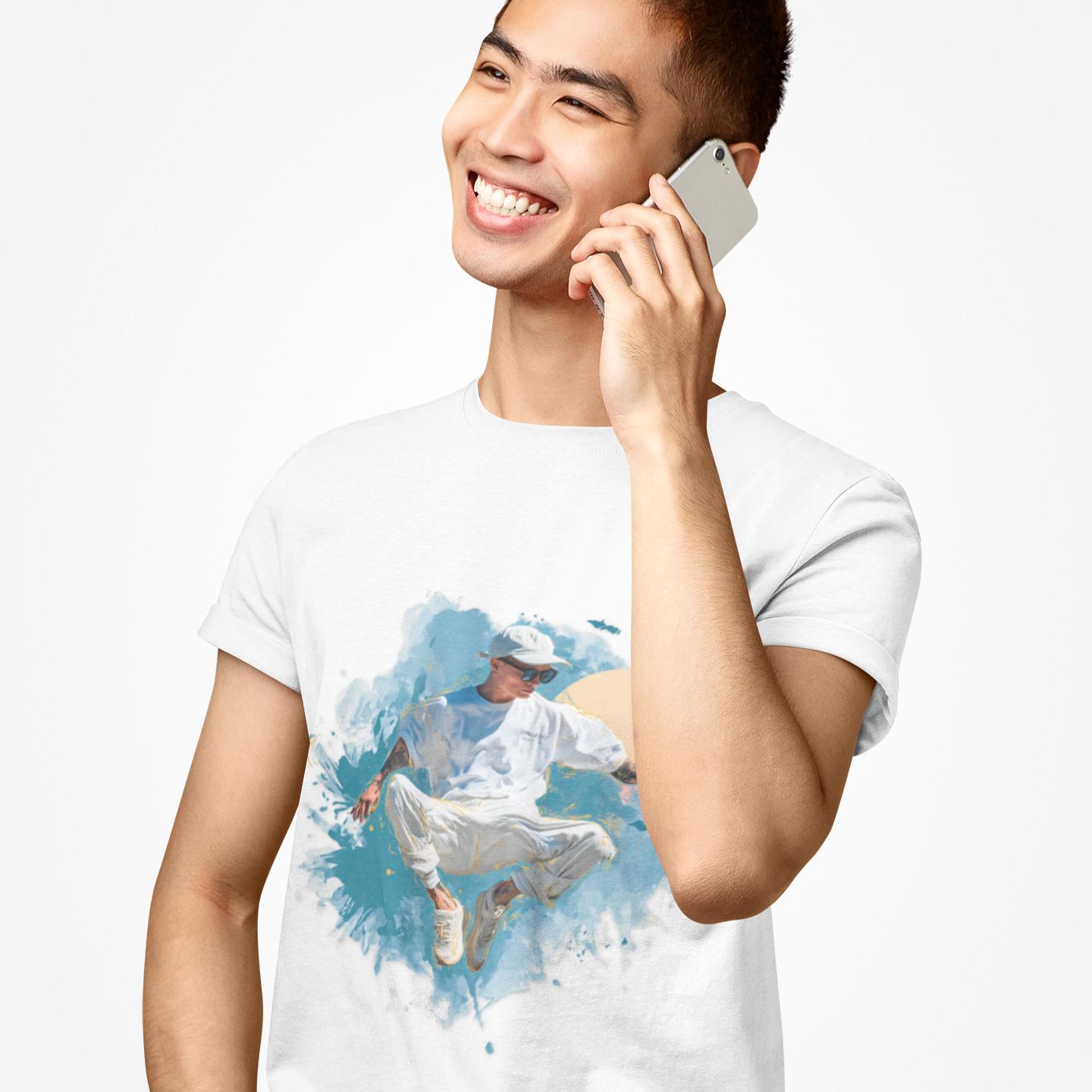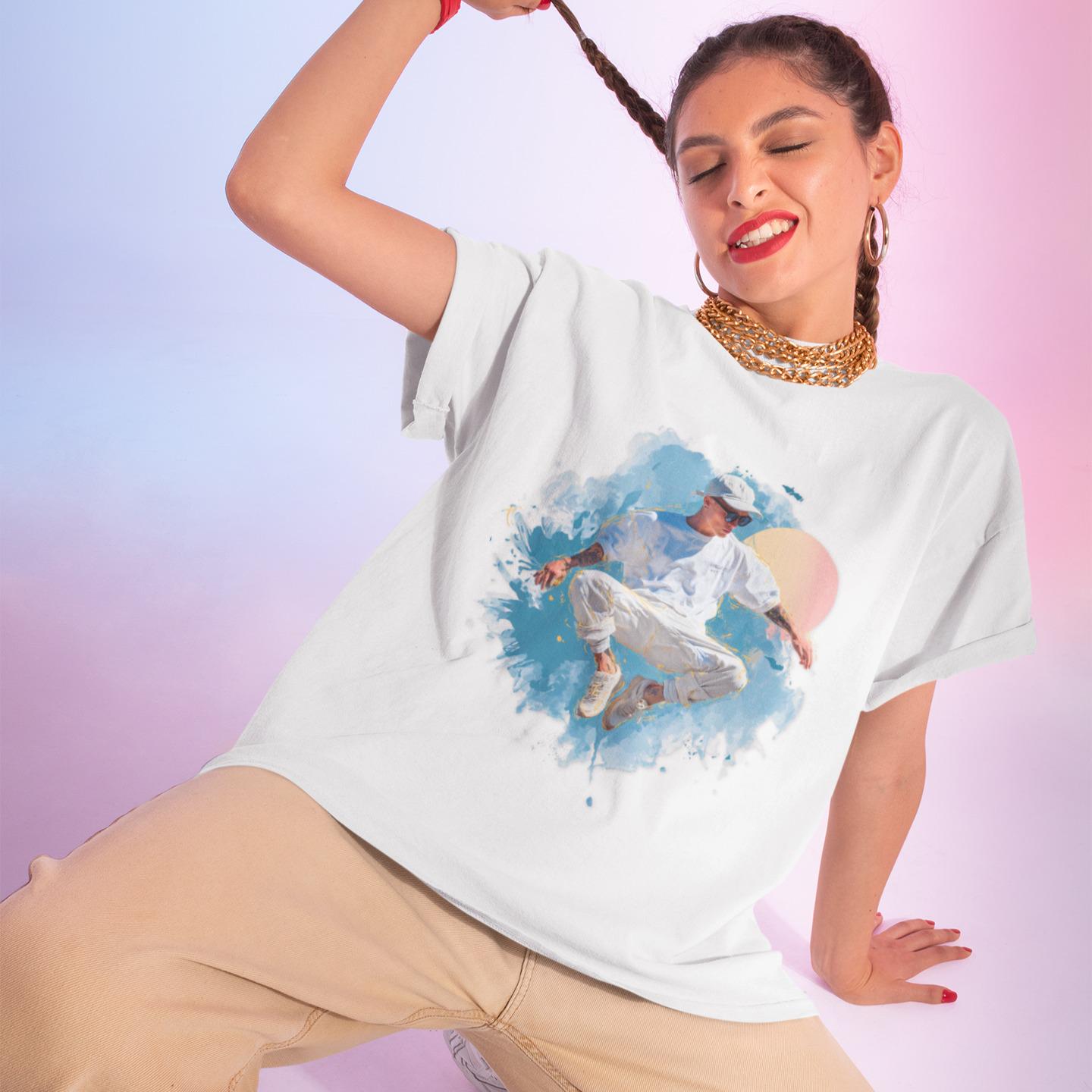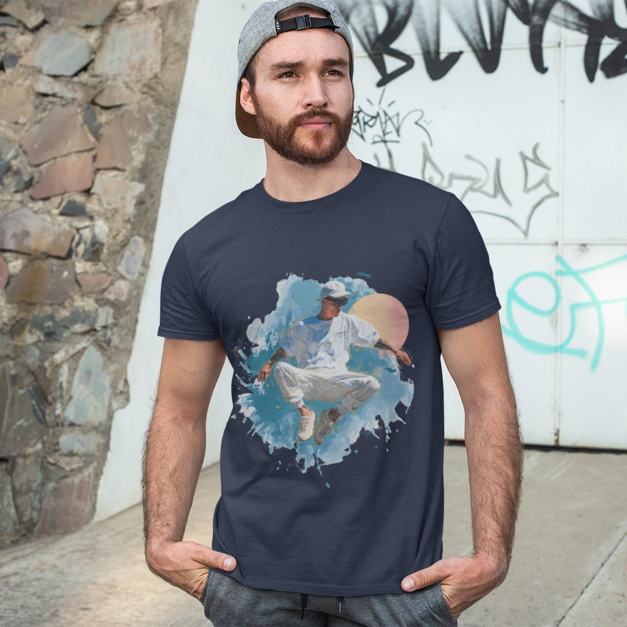 A dynamic and modern unisex T-shirt featuring a male figure in a jumping pose, set against a vibrant watercolor-like background. This shirt exudes energy and style, perfect for those who enjoy unique, artistic designs. Ideal for casual wear or standing out at social events and gatherings. Relevant for birthdays, concerts, art events, and casual outings.