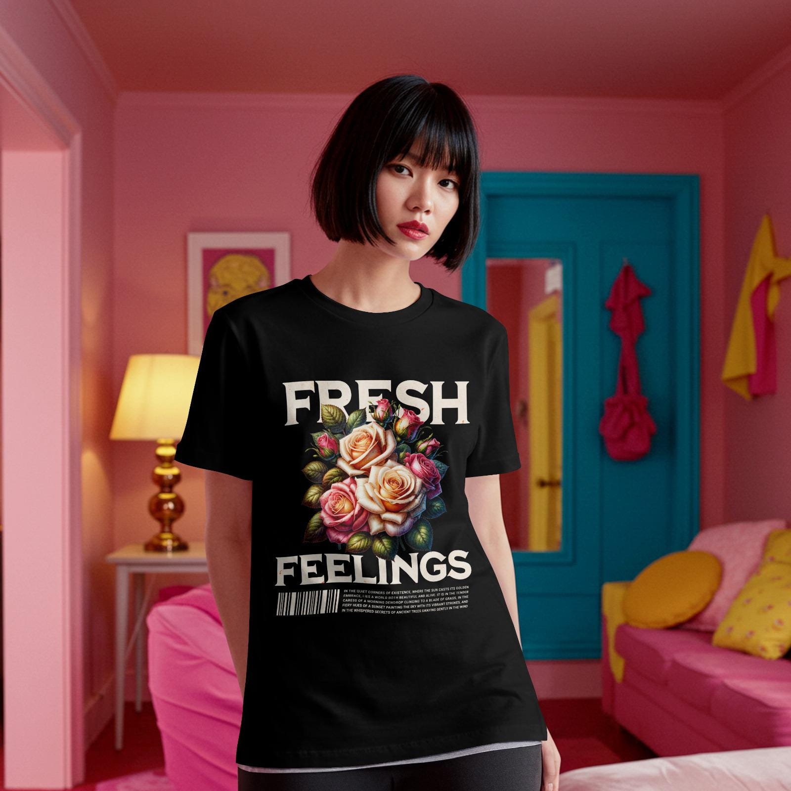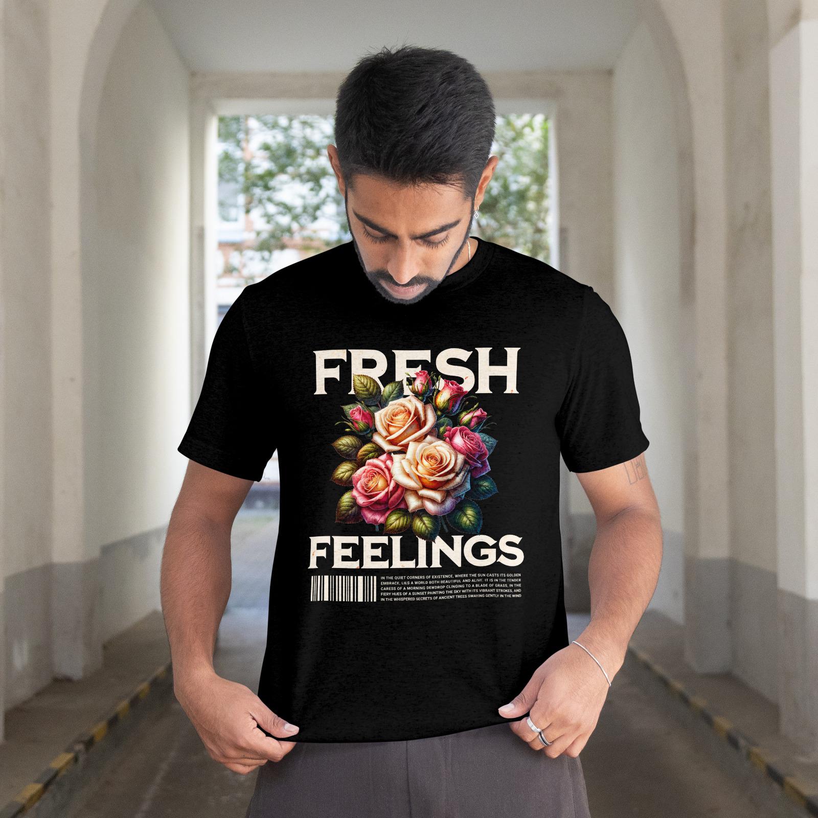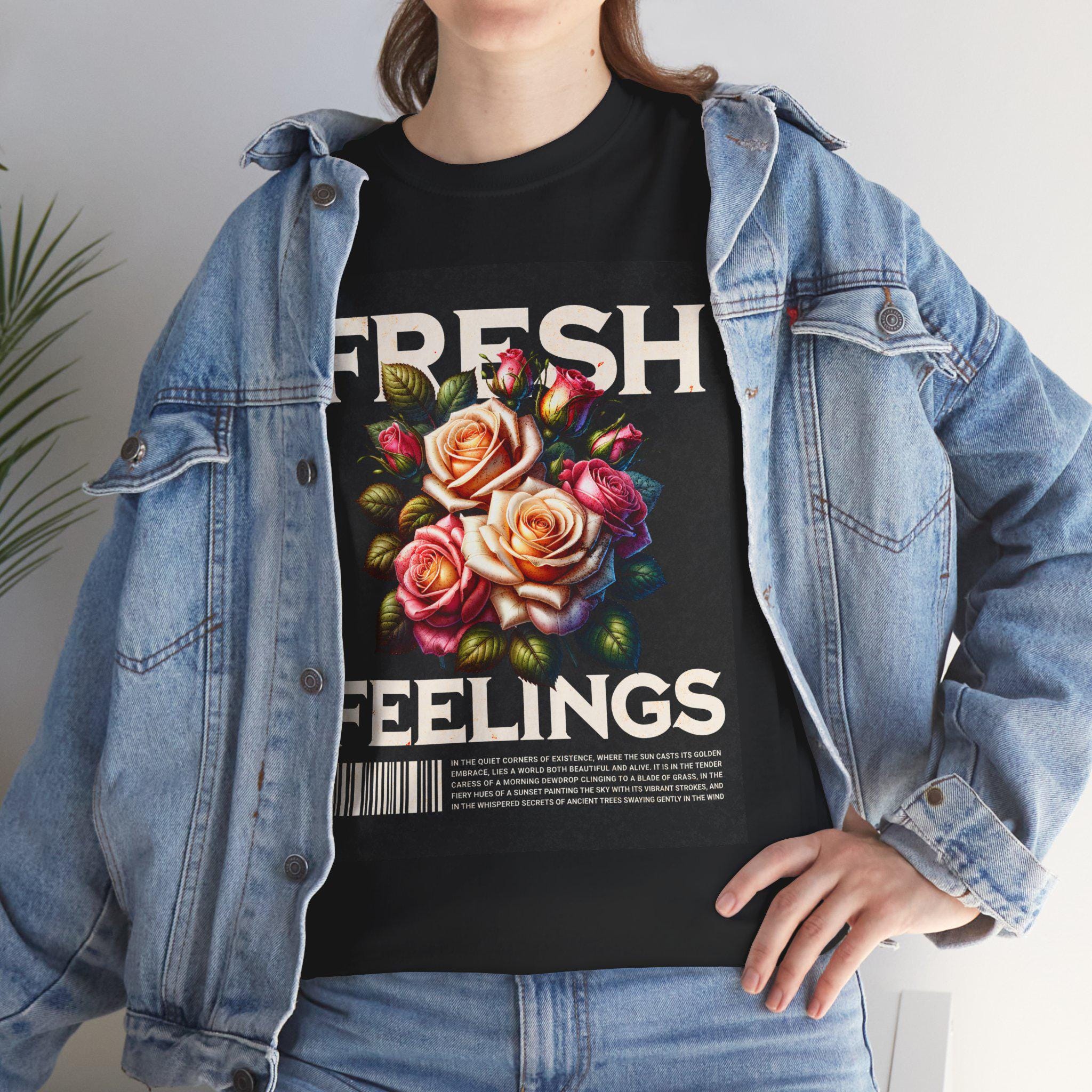This vibrant T-shirt features a graphic design of a bouquet of roses in shades of peach, white, and fuchsia, with the words 'fresh' and 'feelings' in a bold, distressed font. The floral elegance combined with a streetwear sensibility creates a unique and stylish look. Perfect for adults looking for a statement piece that can be worn casually or dressed up.