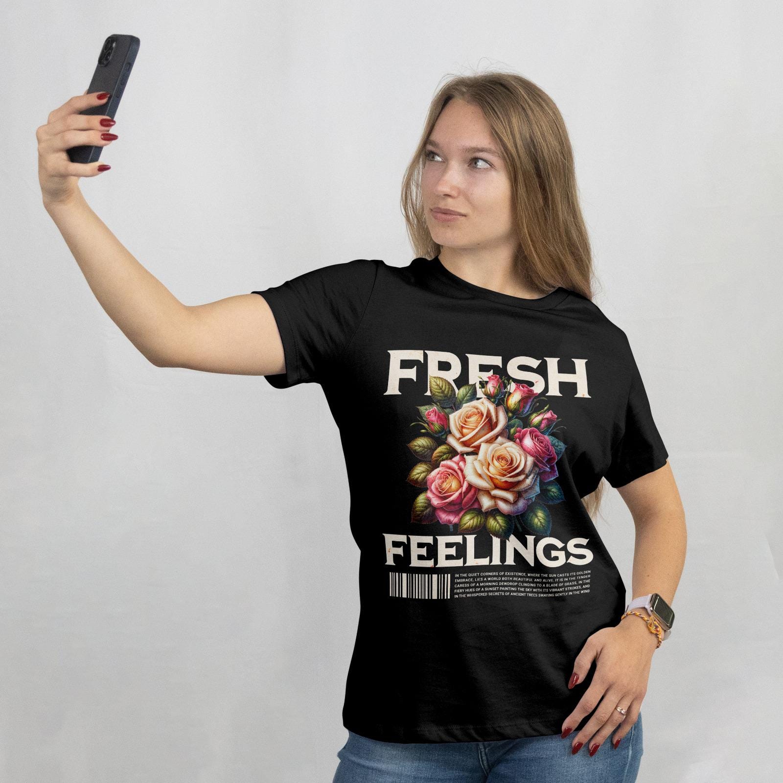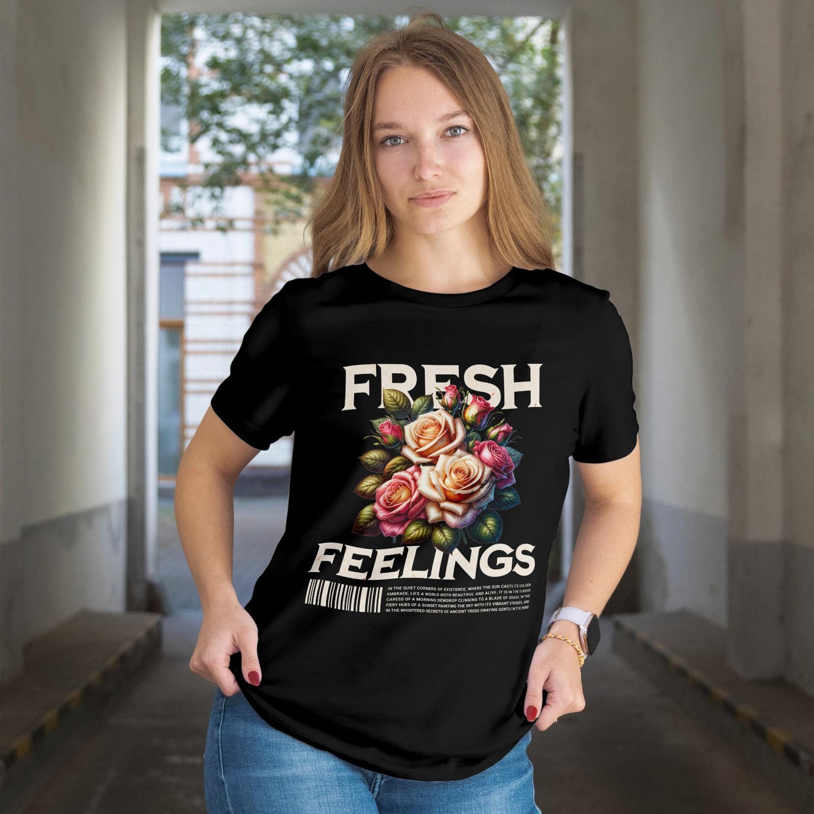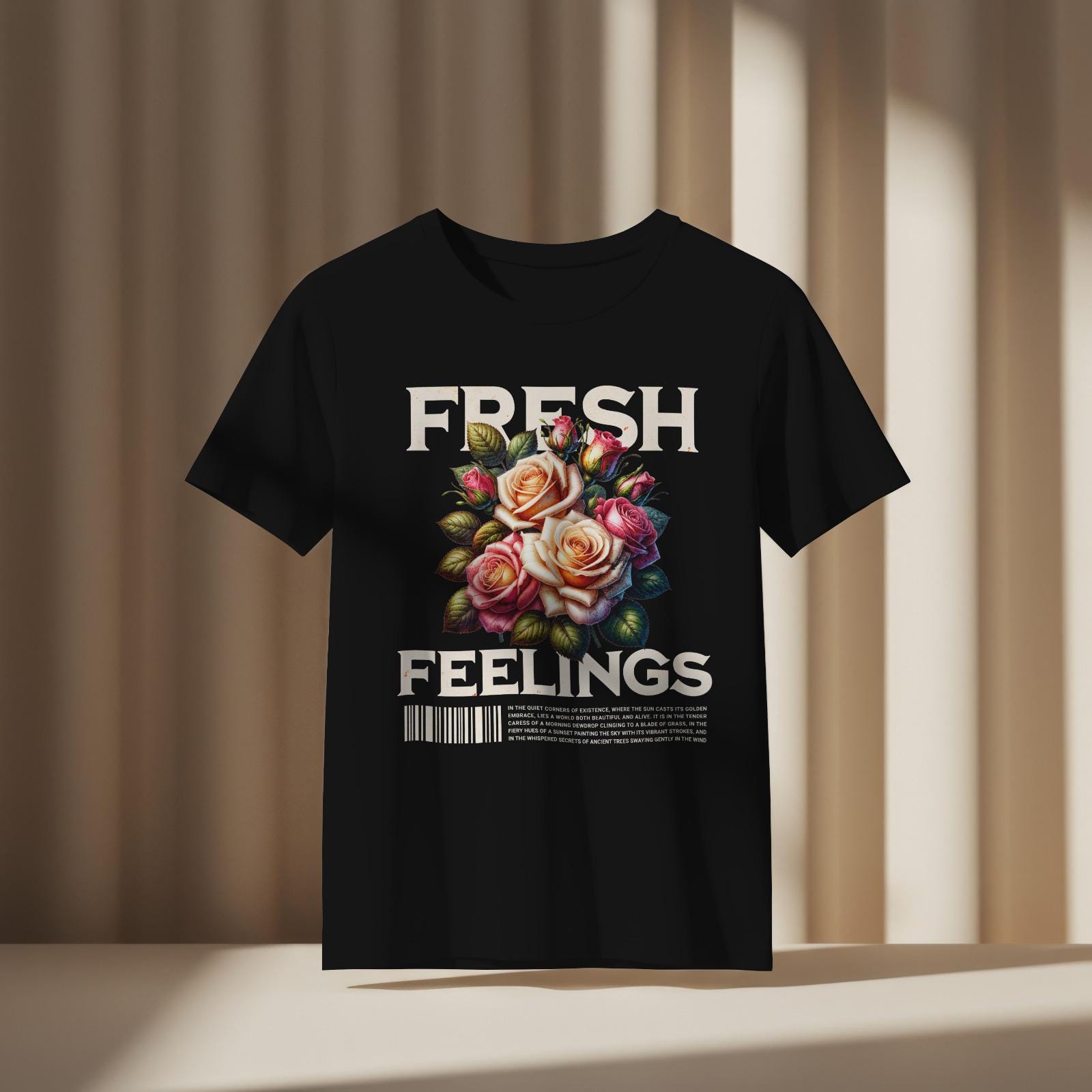 This vibrant T-shirt features a graphic design of a bouquet of roses in shades of peach, white, and fuchsia, with the words 'fresh' and 'feelings' in a bold, distressed font. The floral elegance combined with a streetwear sensibility creates a unique and stylish look. Perfect for adults looking for a statement piece that can be worn casually or dressed up.