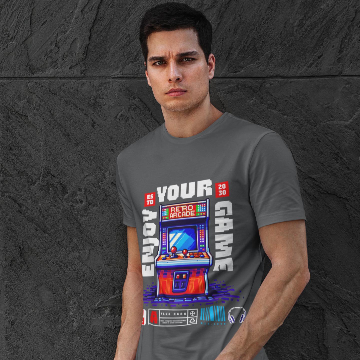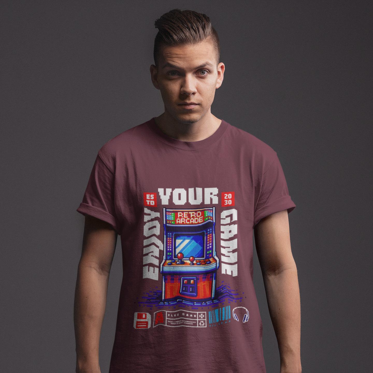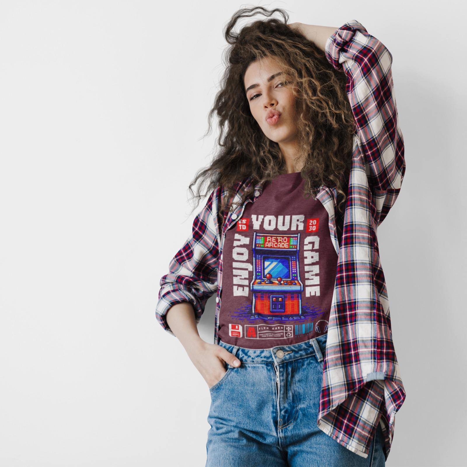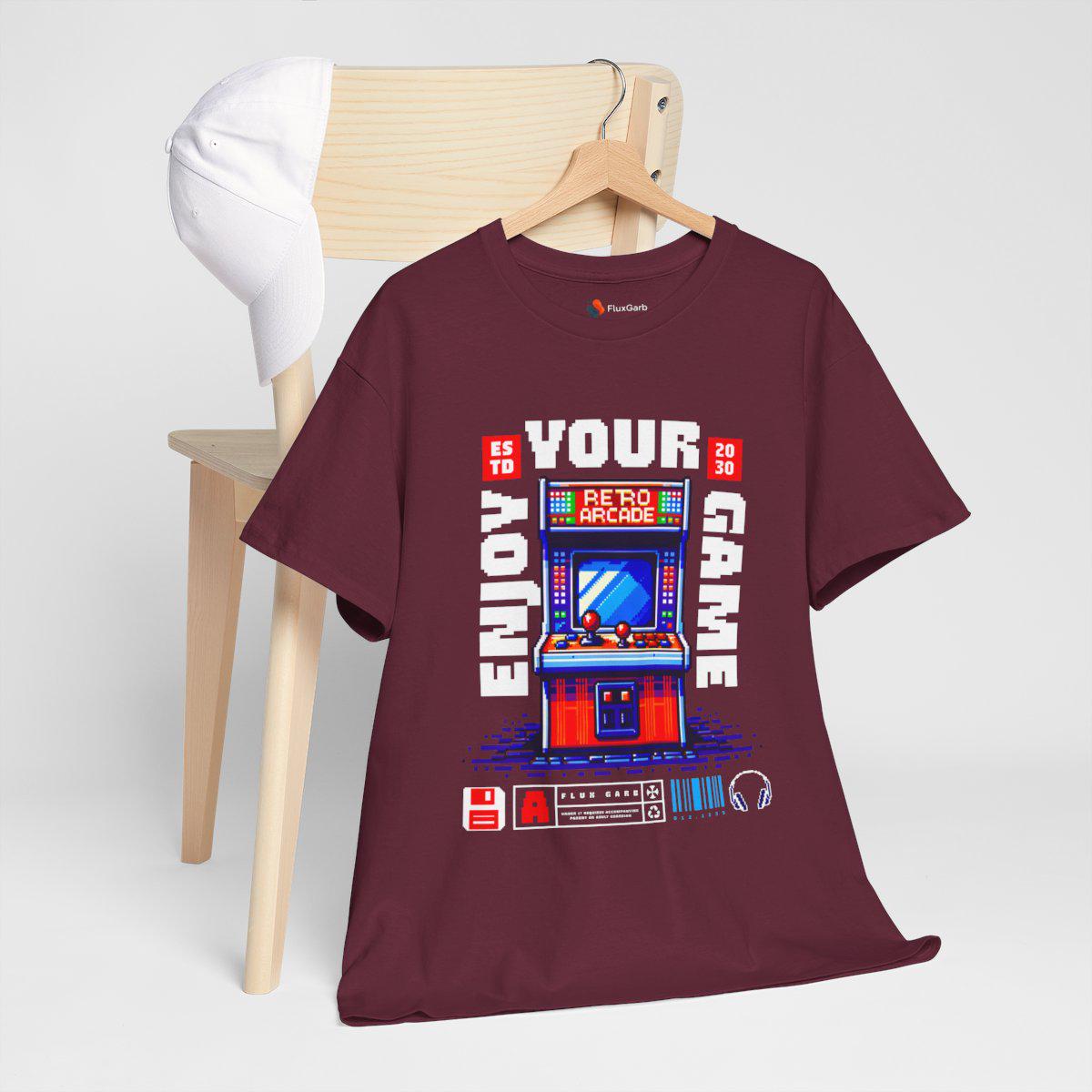 A vibrant, pixel-art style illustration of a retro arcade machine adorns this unisex heavy cotton tee, evoking nostalgia for vintage video games. Perfect for gamers and retro enthusiasts, this tee is ideal for casual wear, game nights, and gaming conventions.