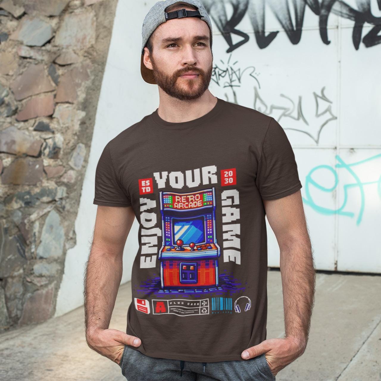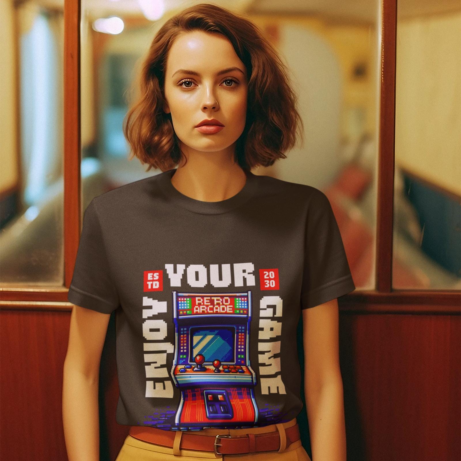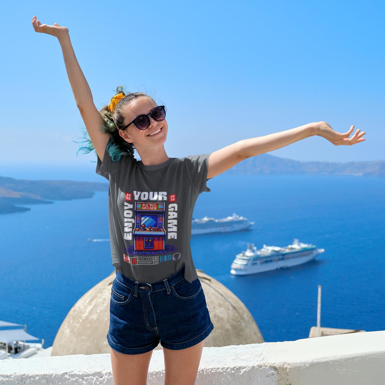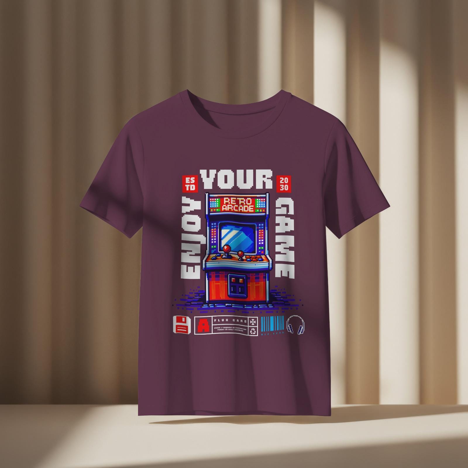 A vibrant, pixel-art style illustration of a retro arcade machine adorns this unisex heavy cotton tee, evoking nostalgia for vintage video games. Perfect for gamers and retro enthusiasts, this tee is ideal for casual wear, game nights, and gaming conventions.