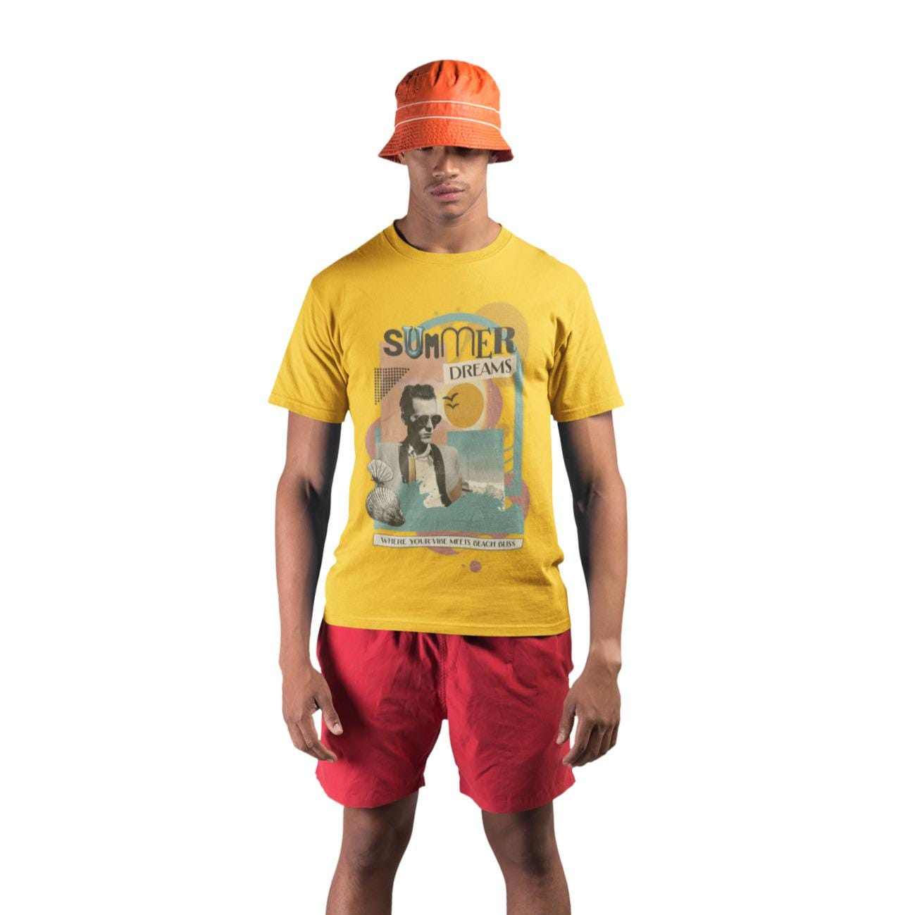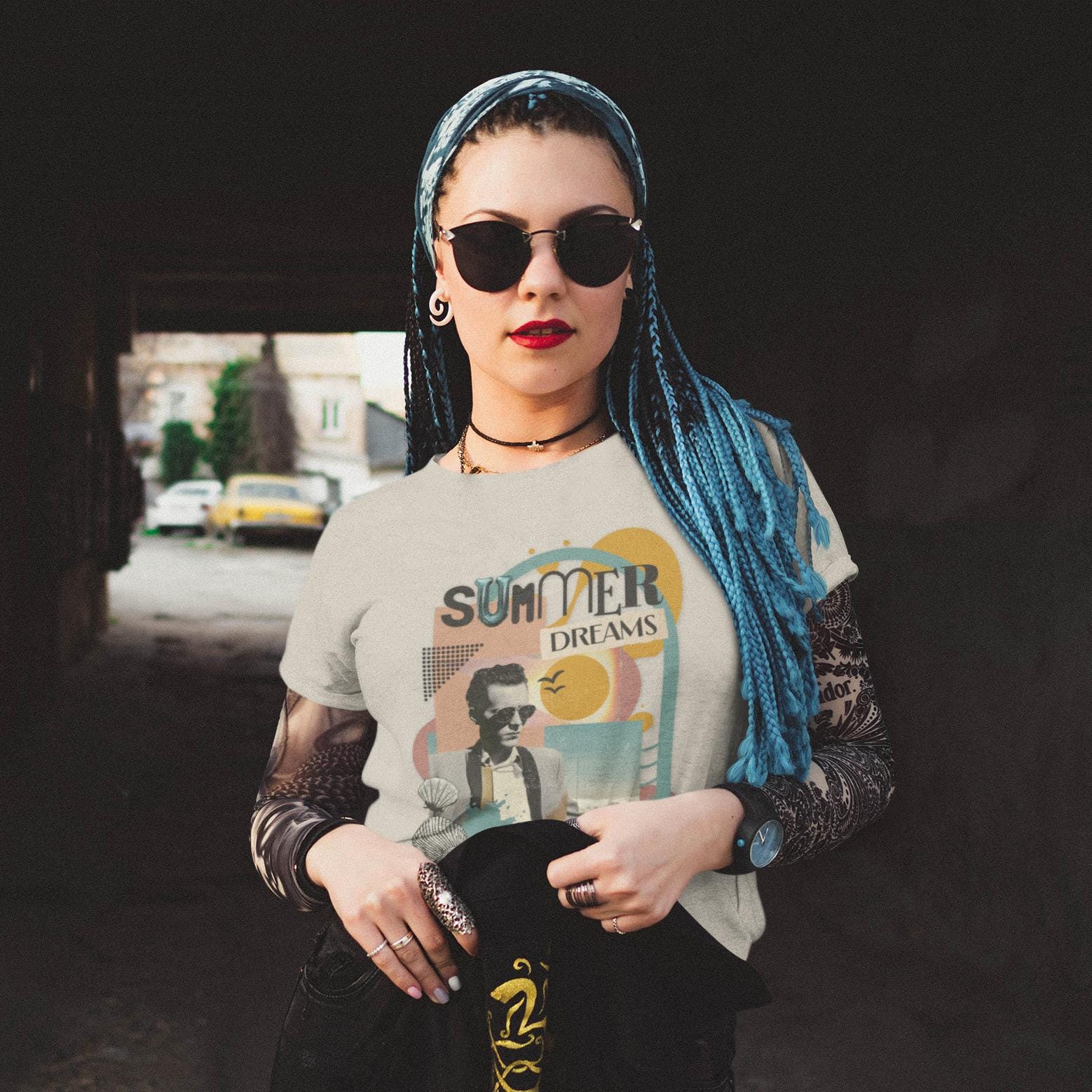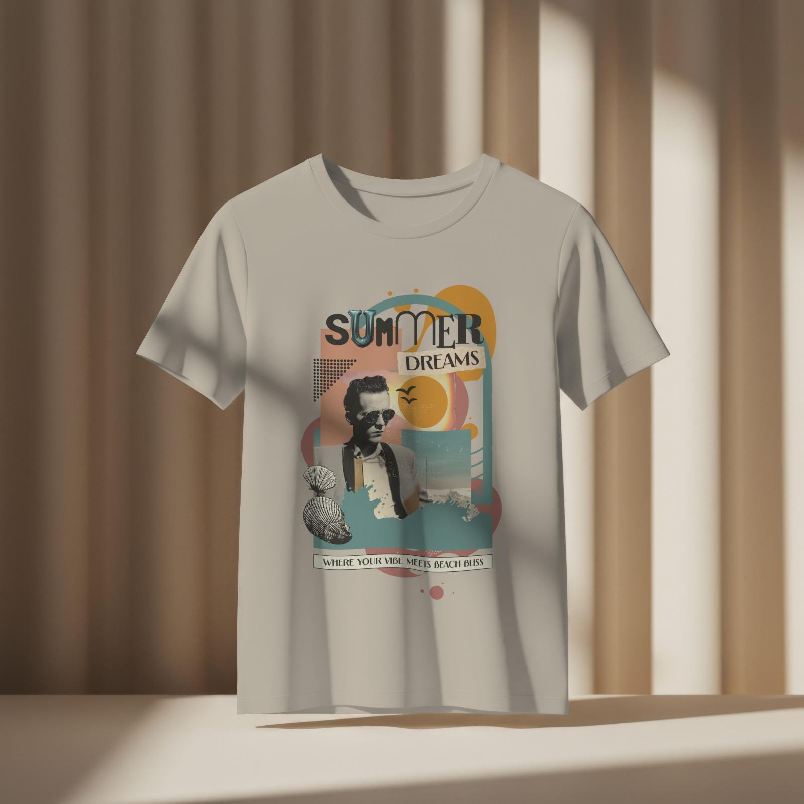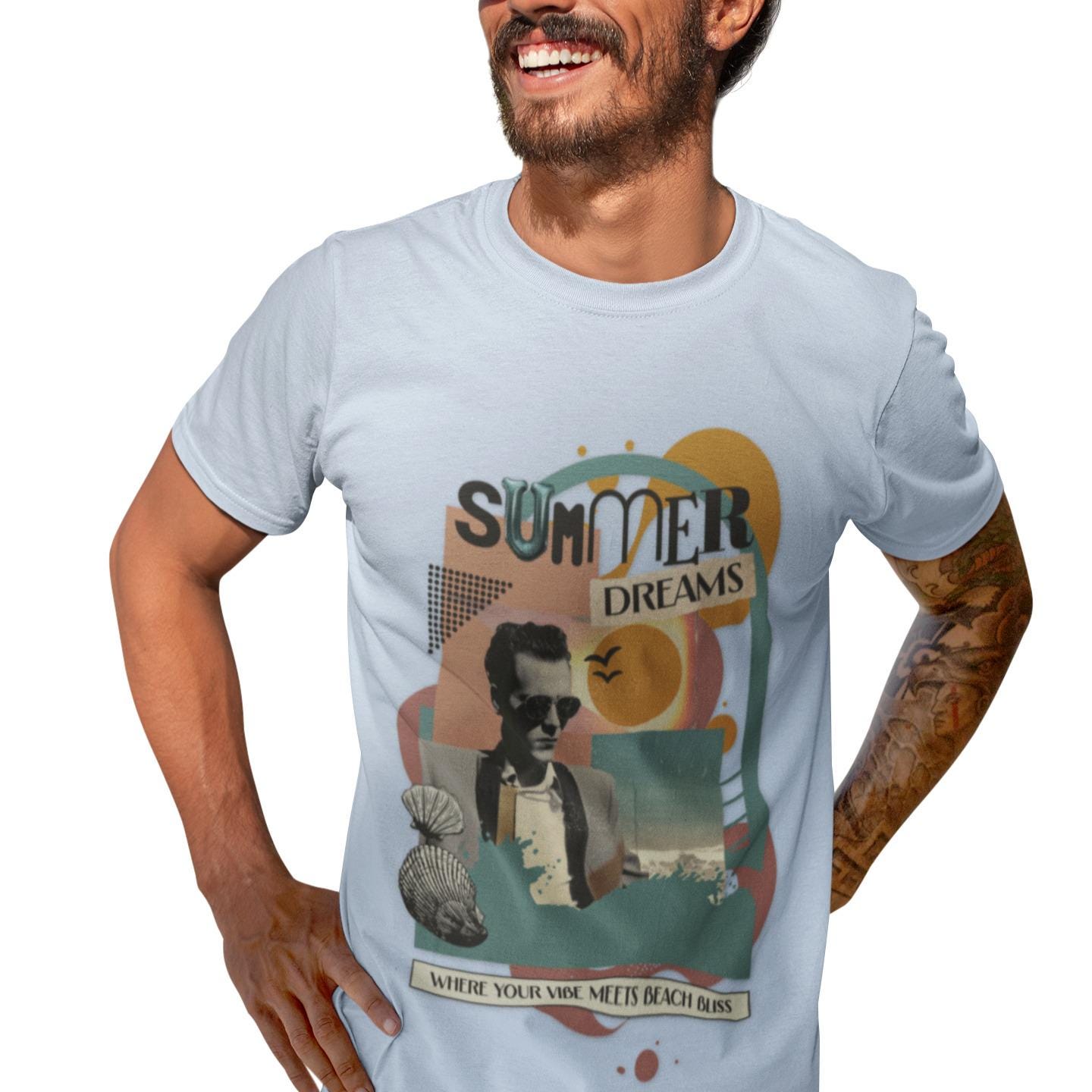 This T-Shirt features a vibrant, collage-style graphic titled "Summer Dreams" with a vintage-style beach theme. It exudes a nostalgic, artistic, and dreamy summer atmosphere, perfect for those who love the beach and relaxed vibes. Ideal for summer vacations, beach outings, and casual wear.
